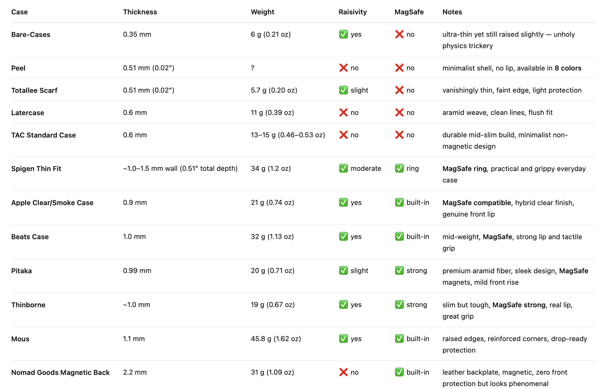 In my quest for the thinnest Air case, here's my latest table. Corrections welcomed. Tempted for the Bare Naked case, haven't seen many reviews