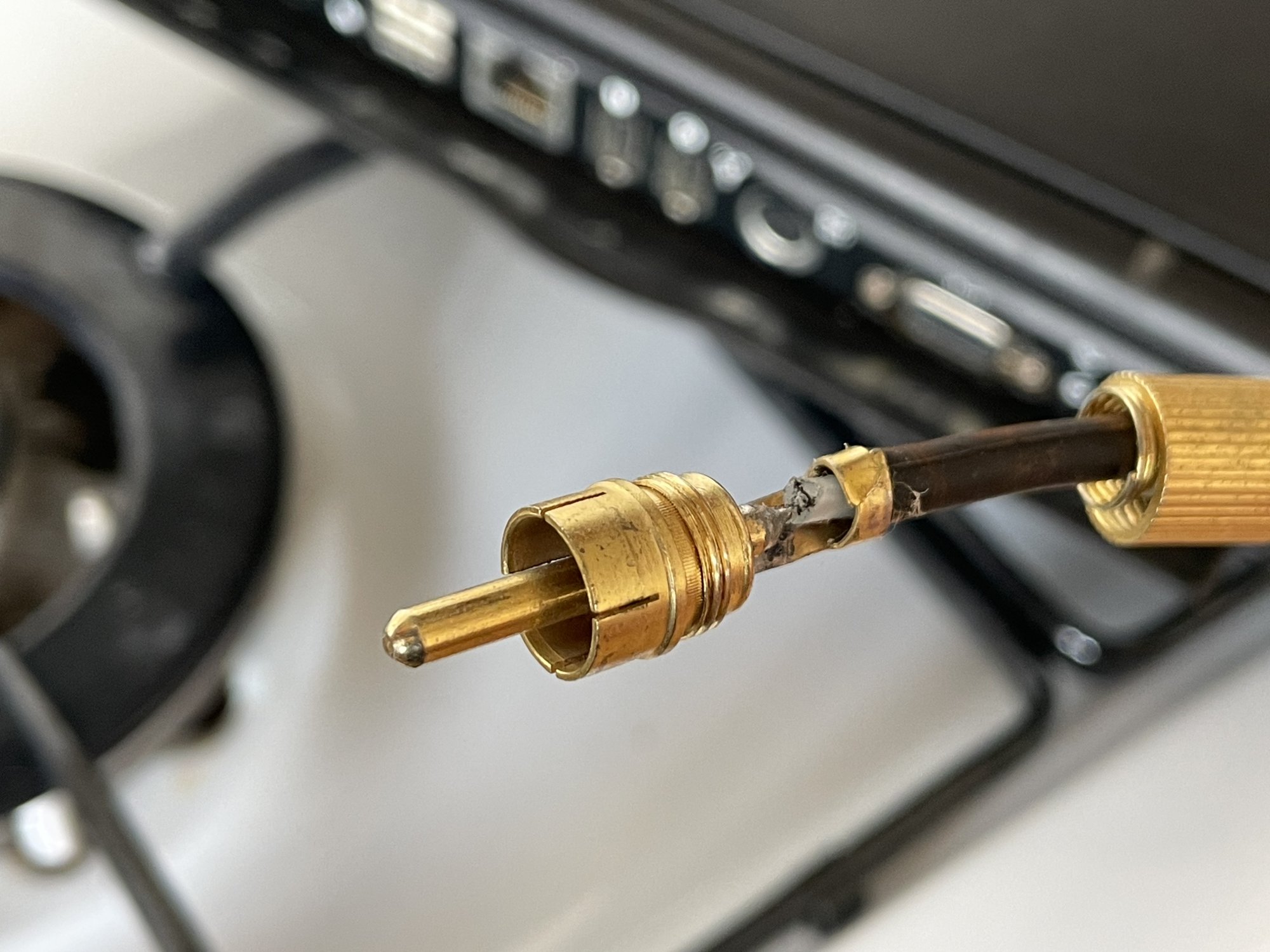 After a couple of day's messing around I hit upon a solution. I realised the metal ring on the Pismo plug is the exact same size as that in an RCA plug. Sadly there's no such thing as a single stereo RCA plug - until now.