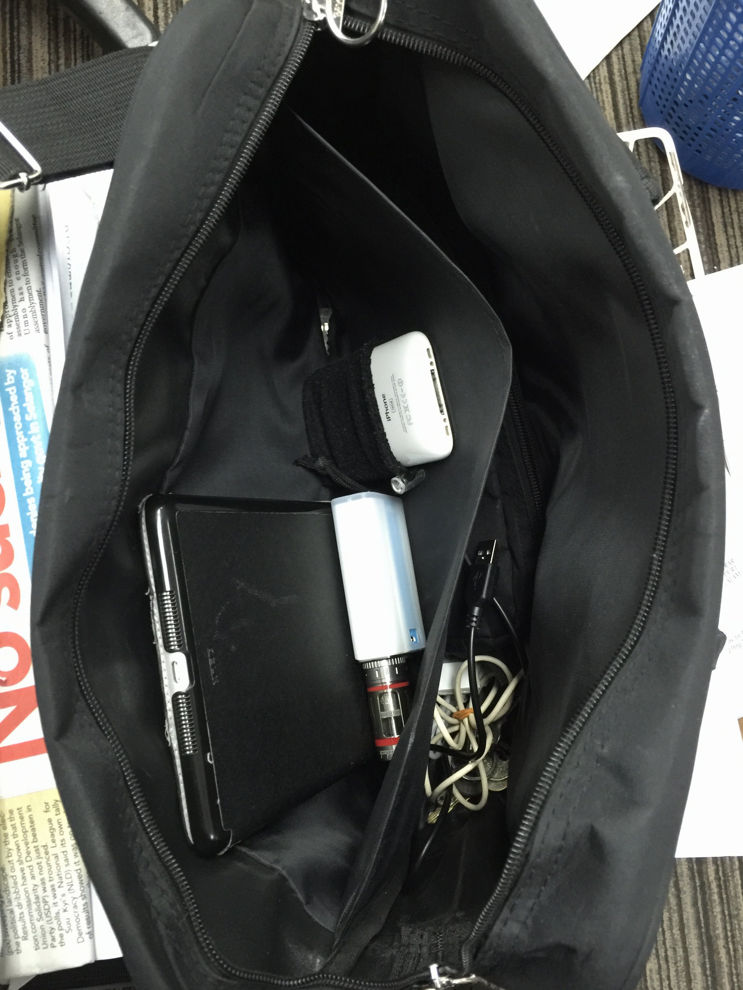 A 3GS???A sling bag whic i got for free..... Packed with chagers, cables, ipad, 3gs and my vapour kit !