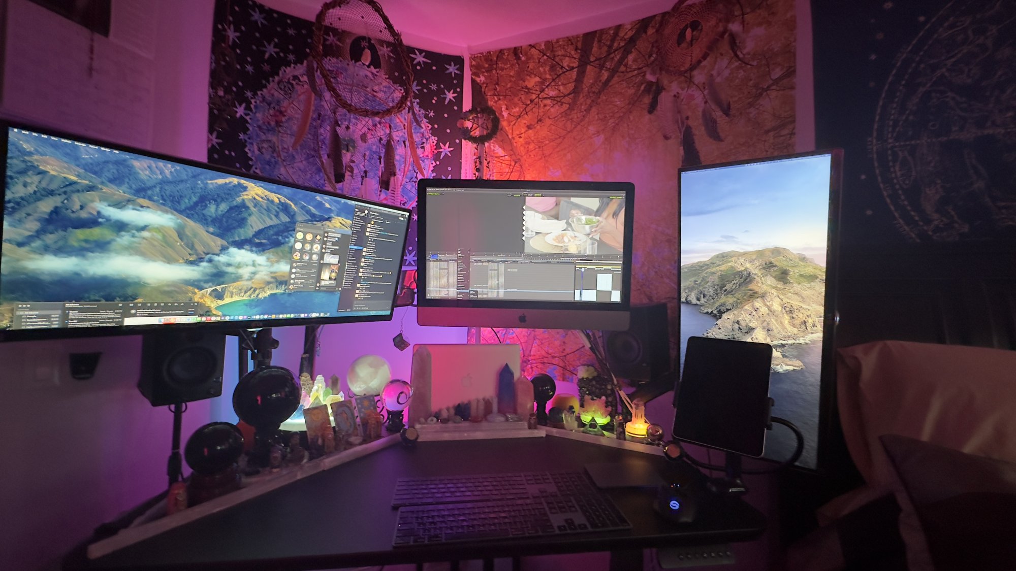 So the desk is my own design and if yo look closely there are 3 30" cinema displays built into the desk (about 4mega pixels each) and the big screen is an 8k 60hz 85" display (about 33 megapixels). So about 55megapixel display. Honestly, this is the first time in my entire computing history when I have "enough" screen real-estate.