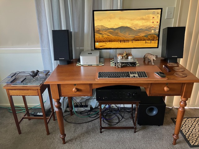 M1 Mini, Dell monitor of some kind, Caldigit hub, AudioEngine speakers, Flexispot desk that occasionally even spends time in standing position. Also a butt mousepad because I am mentally twelve years old and it makes my wife roll her eyes. Or used to. She's become immune. We'll call this the "productivity" desk to maintain the illusion that I am ever productive.