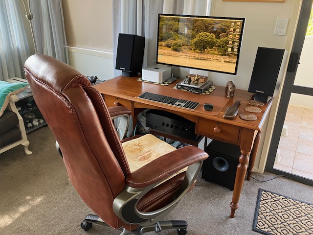 Gaming area with comfy chair, Xbox, PS5, Switch and a Surface Pro 8 hooked up to an eGPU. The TV is a 42" Sony 4K screen, which means by my math that you could fit four of them comfortably into the screen area of that 85" monster that lead me to this thread.