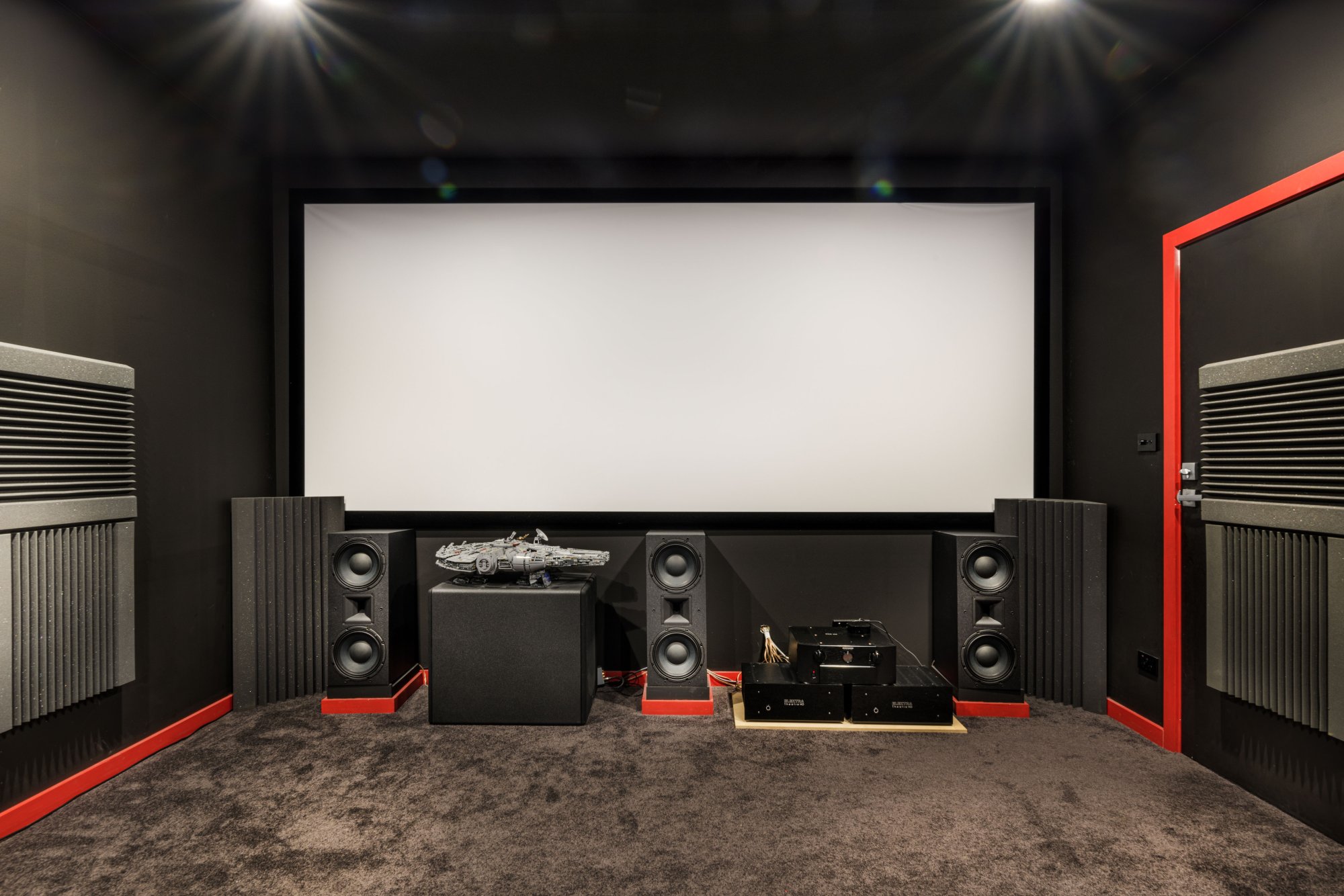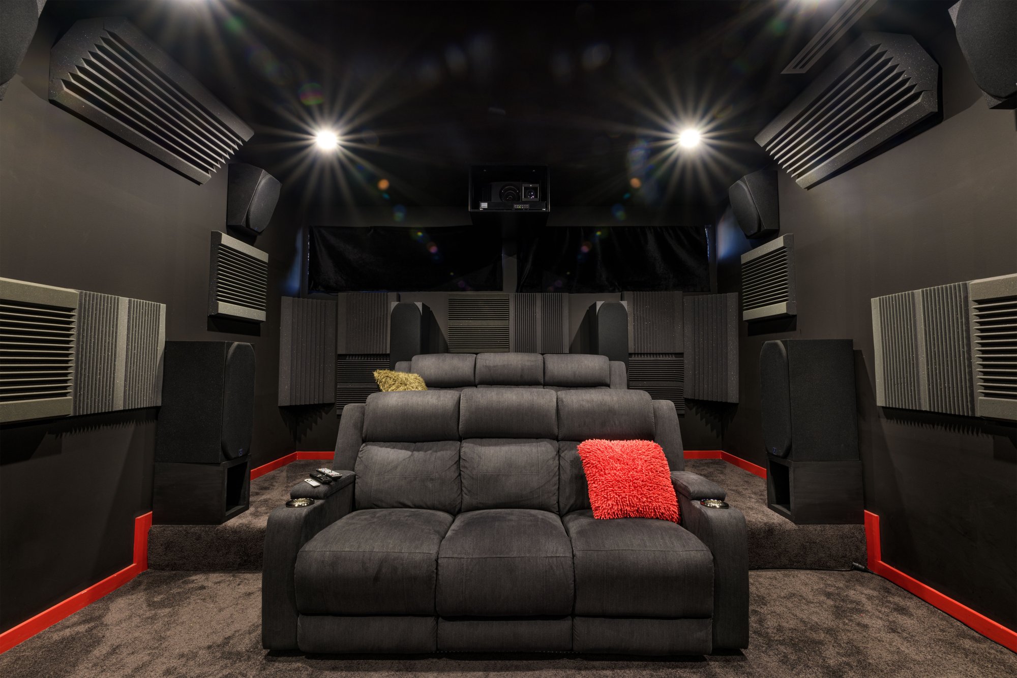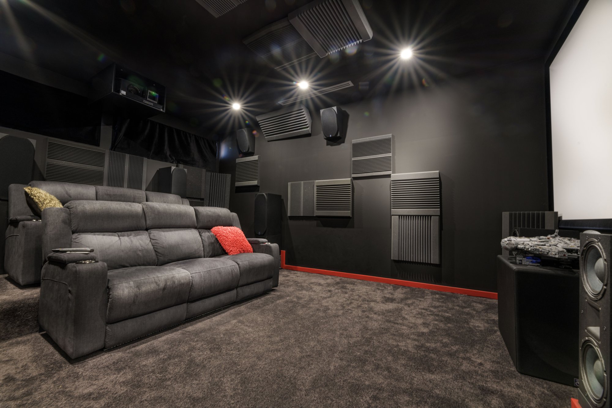 Theater specs: 165" cinemascope screen, 11.1 channel Dolby Atmos sound system powered by a Marantz 8805 AV processor, two 7 channel Elektra power amplifiers with 190w RMS per channel, 11 x Power Sound Audio speakers and a dual 18" subwoofer. Projector is a JVC NX7 and has an anamorphic lens that slides in place when needed.