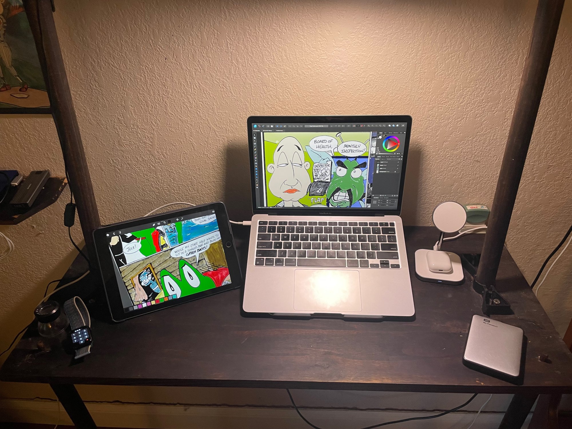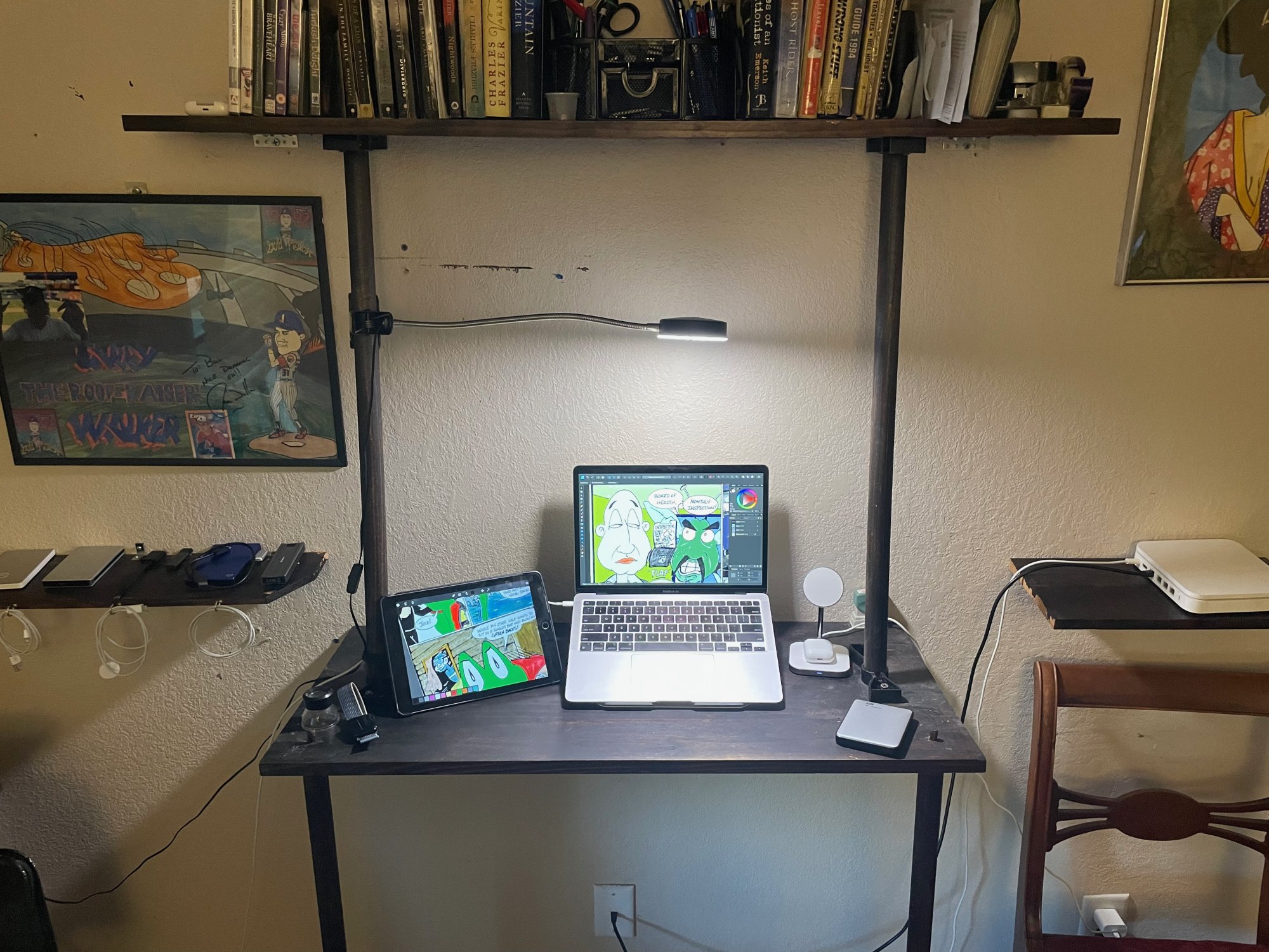 My home office. I have a 2020 top spec i9 iMac, and a maxed out M2 Midnight Air. My wife's iMac on the right is my previous iMac i7.