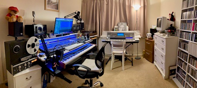 Well, most of it. The bits behind me out of sight are just more CDs, my wardrobe, and 'messy corner' where I store the gear I'm not currently using (mostly vintage tape rercorders).