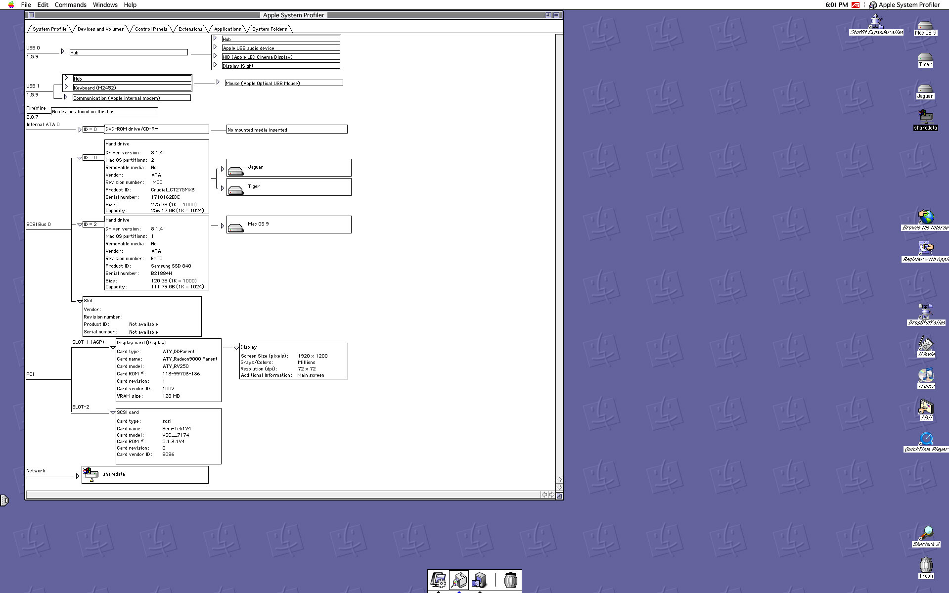 Also, I got the adapter that allows me to use my Apple LED Cinema Display since I stopped using it after retiring my MacBook Pro 15" mid-2012. The webcam and audio doesn't work in Mac OS 9, but it does in Mac OS X. Also installed all the Unsanity Haxies because why not.