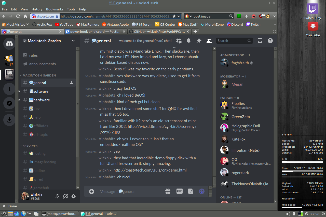 Are audio calls possible?Today i tested discord on my powerbook g4. Oddly (and amazingly) it works reasonably well (better than on snow leopard). Switching the appearance to compact mode (displays less eye candy) really sped it up.