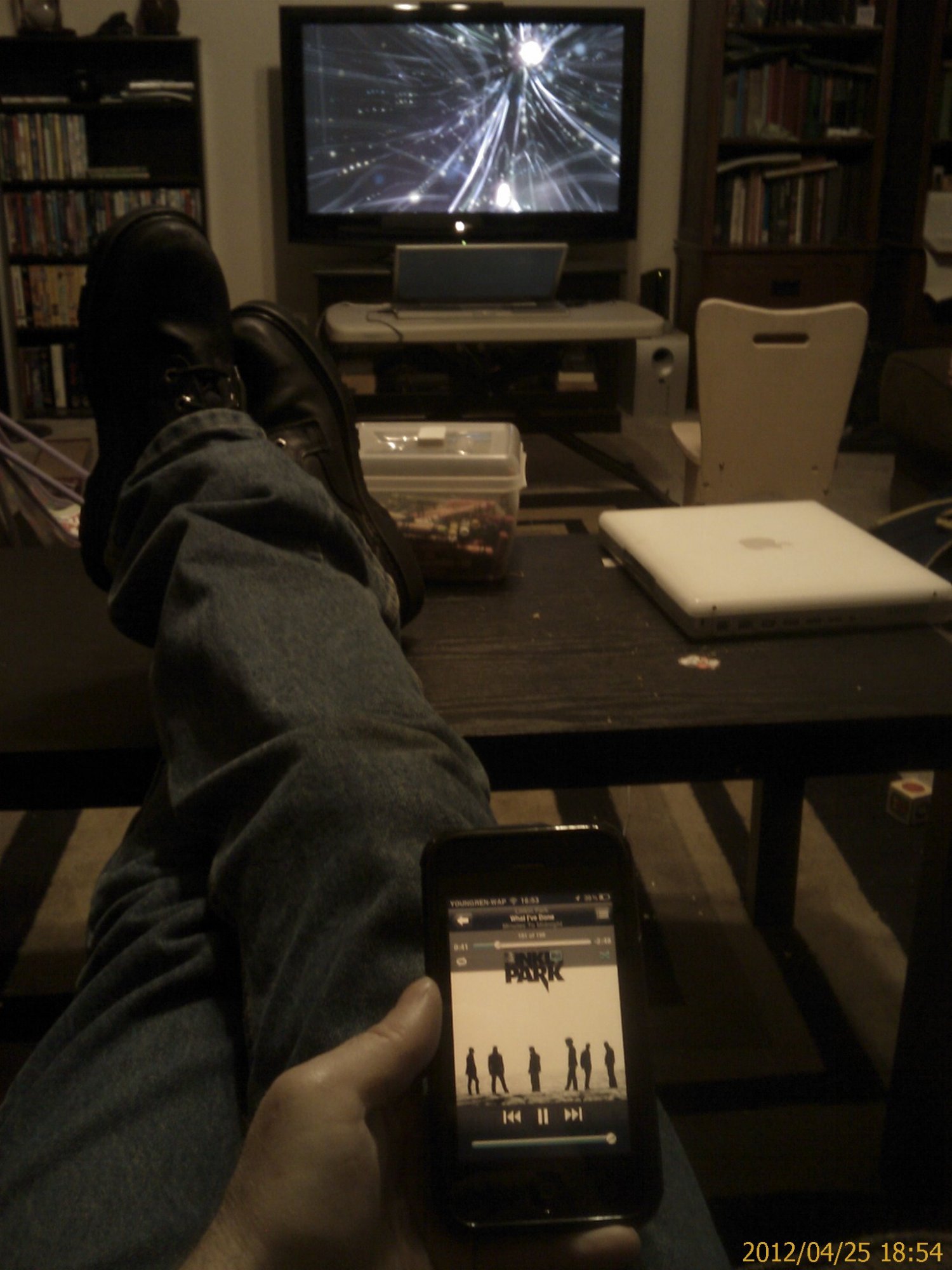 17" PowerBook G4 1.67Ghz DLSD-HD running iTunes. Connected to TV with iTunes visualizer on. I am controlling iTunes using the app (forget the name, but it's stock Apple) on the iPhone 3GS.