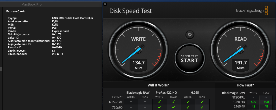 3. Delock TB external enclosure , 1/2 full Samsung EVO860 250GB connected to the same MBP - 380 MB/s reads, 350 MB/s writes.