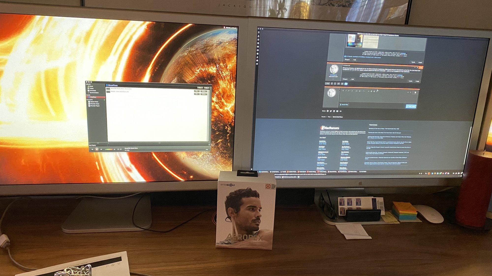 Streaming Dronzone via Nightingale to my new bone conduction headphones (Aftershokz Aeropex) via bluetooth on the Mac Pro. Love these new headphones as I can still hear regular ambient sound and they are comfortable - unlike on-ear headsets or in-ear pods/buds.