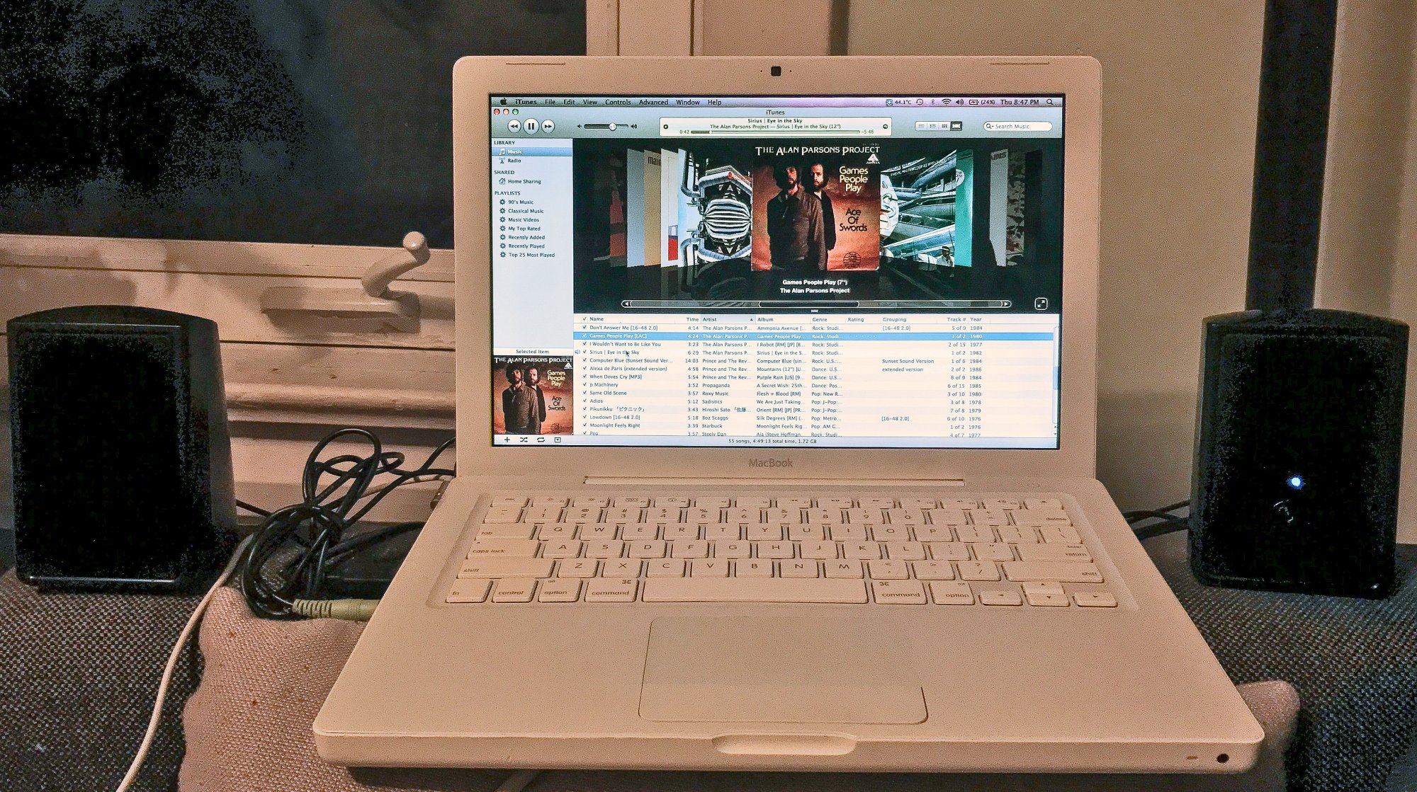 I tried setting up the songs I brought in iTunes 12 on the MB’s Mountain Lion partition, but found there are audio driver issues which have come up for others before. So I rebooted to the 10.6.8 partition and launched the indefatigable iTunes 10.6.3, to find the speakers worked, but sounded like trash (especially the left).
