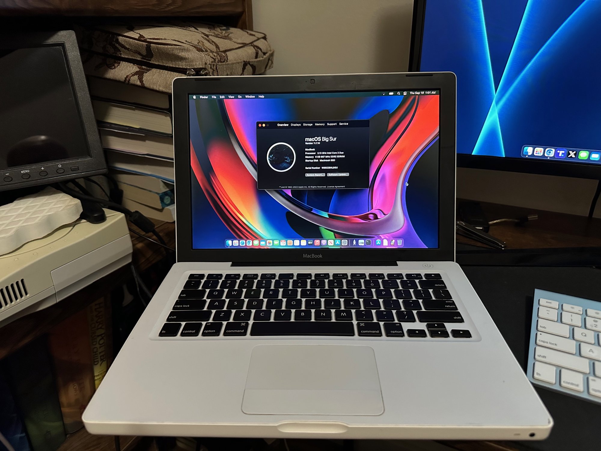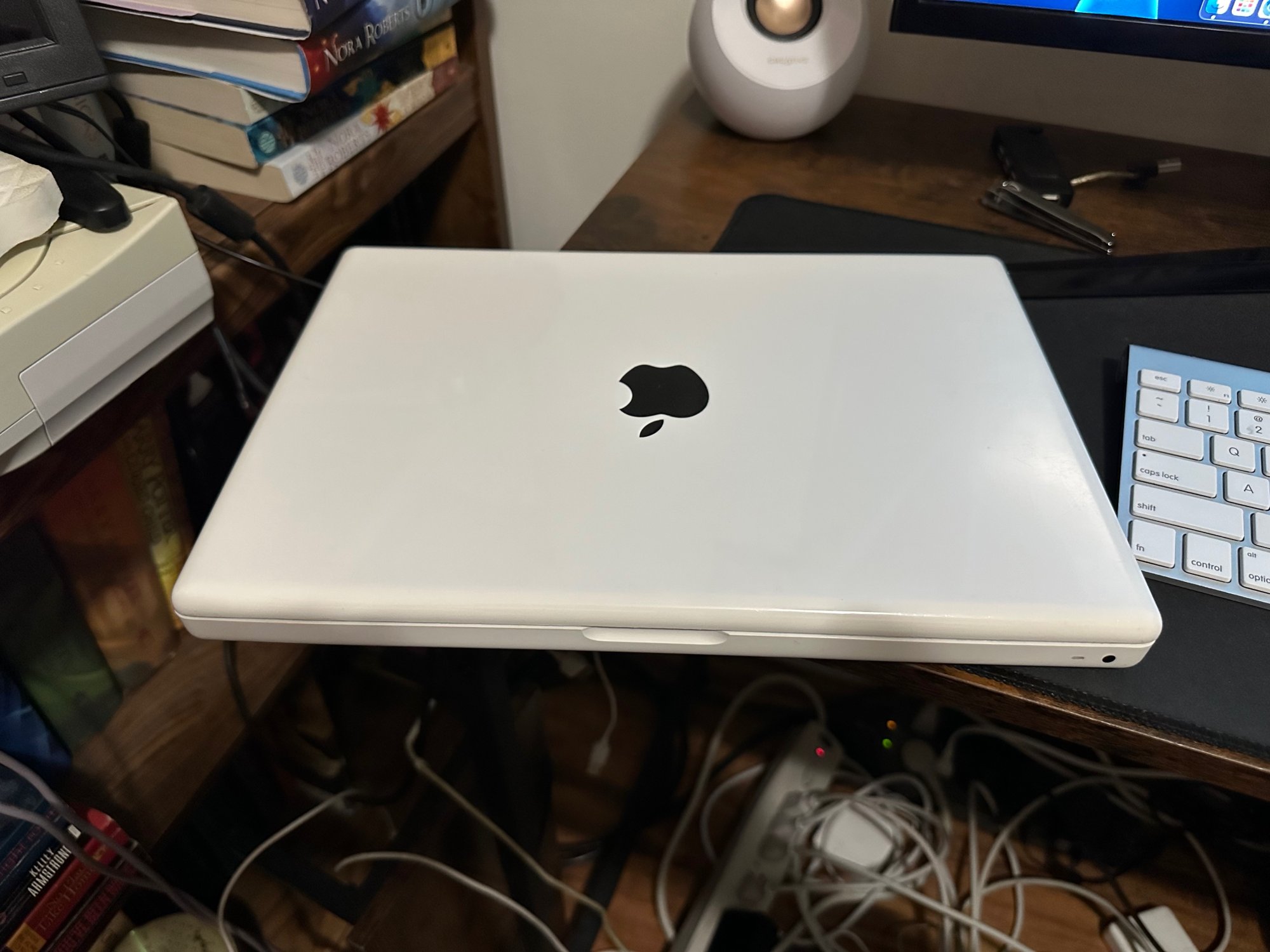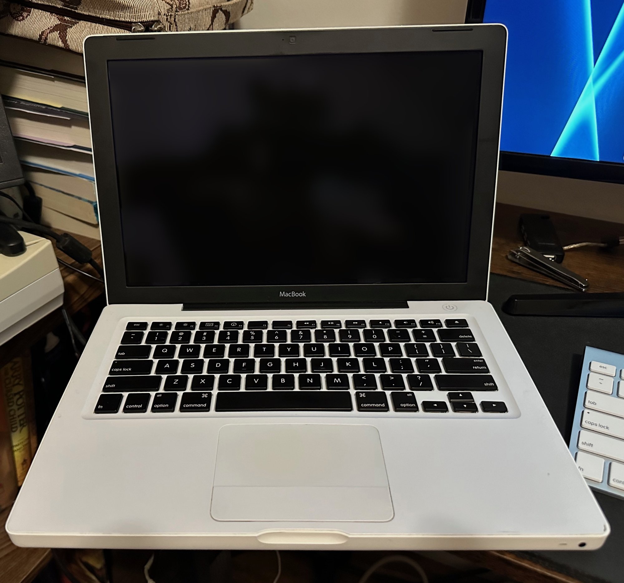 Utilizing my large pile of A1181s in various colors, I "oreo-ed" (or, as @B S Magnet calls it, "piano-ed") my white 2009 Macbook. I stripped down the entire machine, removed the display, then removed the LCD and the Apple logo, and hit the logo with two coats of Plasti-dip, as it has the textured look I wanted, plus I could peel it off if I screwed it up. I reassembled the display using a black clutch cover and bezel, then cleaned out the interior of the case, as well as the fan and mainboard. I repasted the CPU and GPU, then took a $10 optical drive to hard drive caddy apart so I could fit the connector in the machine for a secondary SSD (it wouldn't fit otherwise). I just used some double-sided tape to hold the connector to the case, and a command strip for the drive, in case it ever needed replacing. I put everything back together, then stripped the keys off a (sadly) dead black keyboard (the plastic has no chips in it, hence, "sadly") and replaced the keys on the white top case. The RAM got upgraded to 6 gb. Prior to starting this project, I installed Windows 10 on the secondary drive, using a DVD that I modified for my now-dead 2006 Mac Pro, hunted down a couple of drivers that Boot Camp didn't have, and installed 64-bit drivers individually from the Boot Camp archive. I can boot that up to play some Visual/Future Pinball and for other times I need a Windows machine. The main drive got Big Sur via OCLP, as that seemed to be the sweet spot OS between old and newer for this machine.