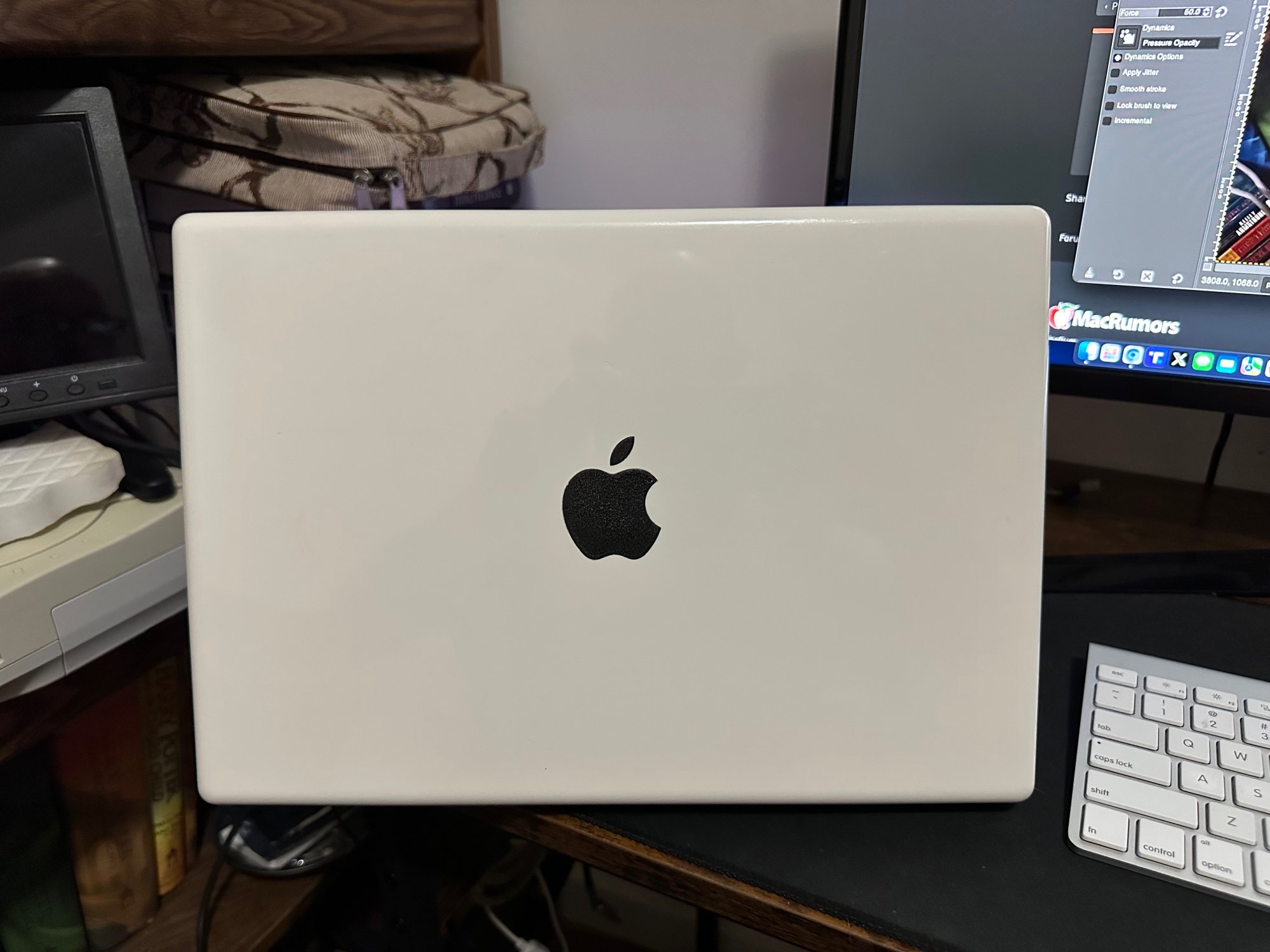 While that is actually a silver aluminum 2023 MBP, the lighting makes it look white to my aged eyes, and I thought it would be cool to have a white Macbook with a black Apple logo. Here are the results: