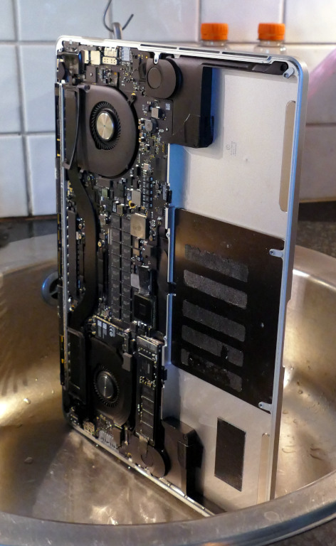 Frack! I am quite mad at myself now. View attachment 2444310 While testing the MBP mid 2014 + eGPU I managed to knock over a full glass of (sugar free) juice on top of the MBP kbd. Turned power off and took the bottom off immediately. Some was dripping on the other side near the right speaker. Now I am happy that I do not glue the new batteries in so it was easy to take out.