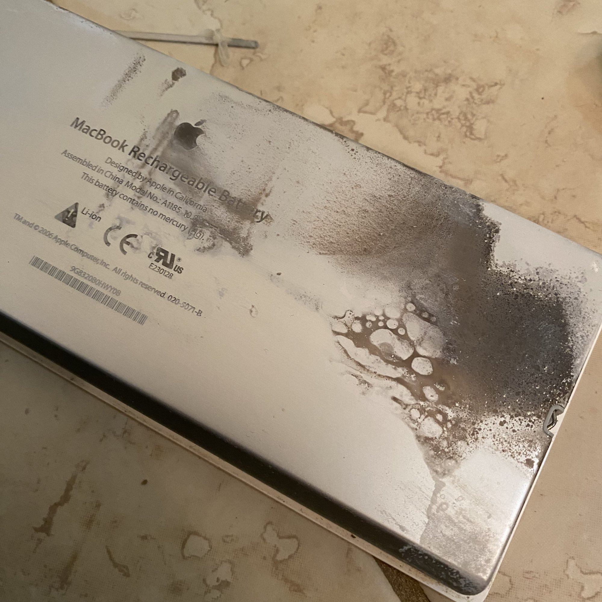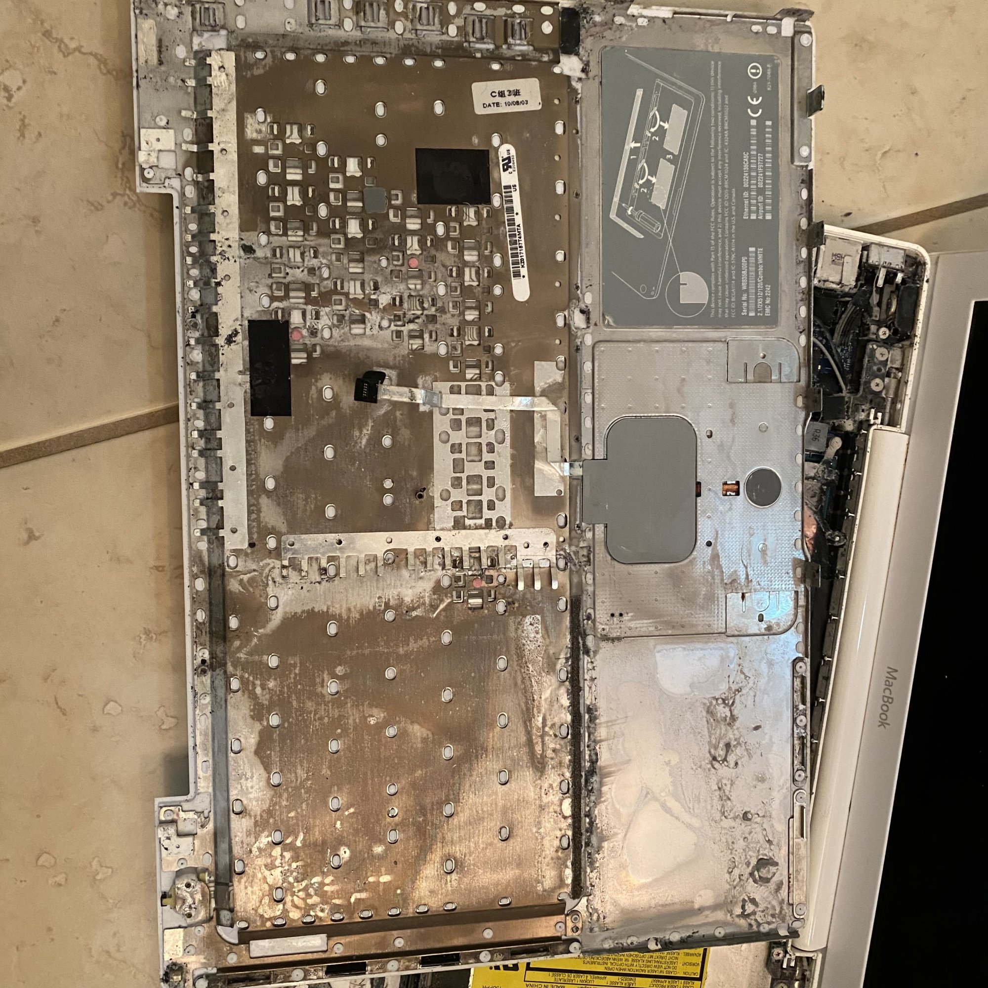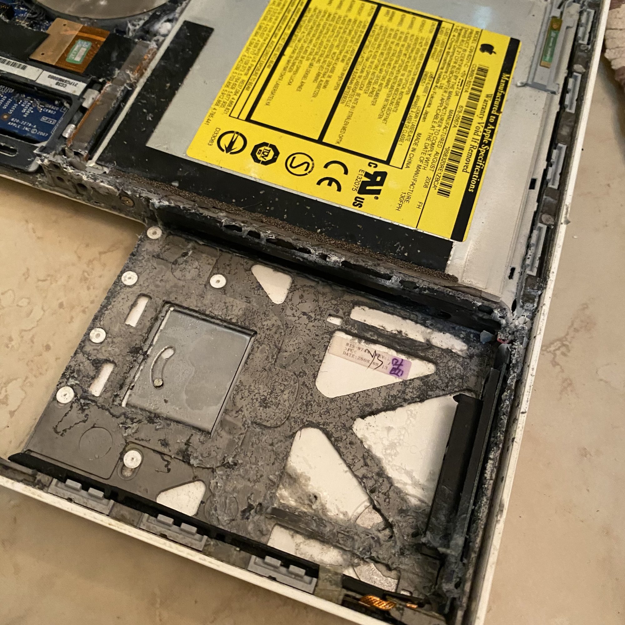 Needless to say, the machine won't boot, and doesn't give a green light when plugged into a MagSafe charger. I was hopeful I could salvage some components but apart from the hard drive caddy and the case screws it looks like the machine is completely FUBAR'd.