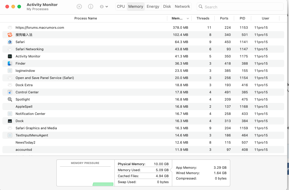 This is mine 2011 MacBook Pro 15" with 10GB of RAM looks like. With 1 Safari tab only, I am already at 5.09GB. I have zero idea why and how.
