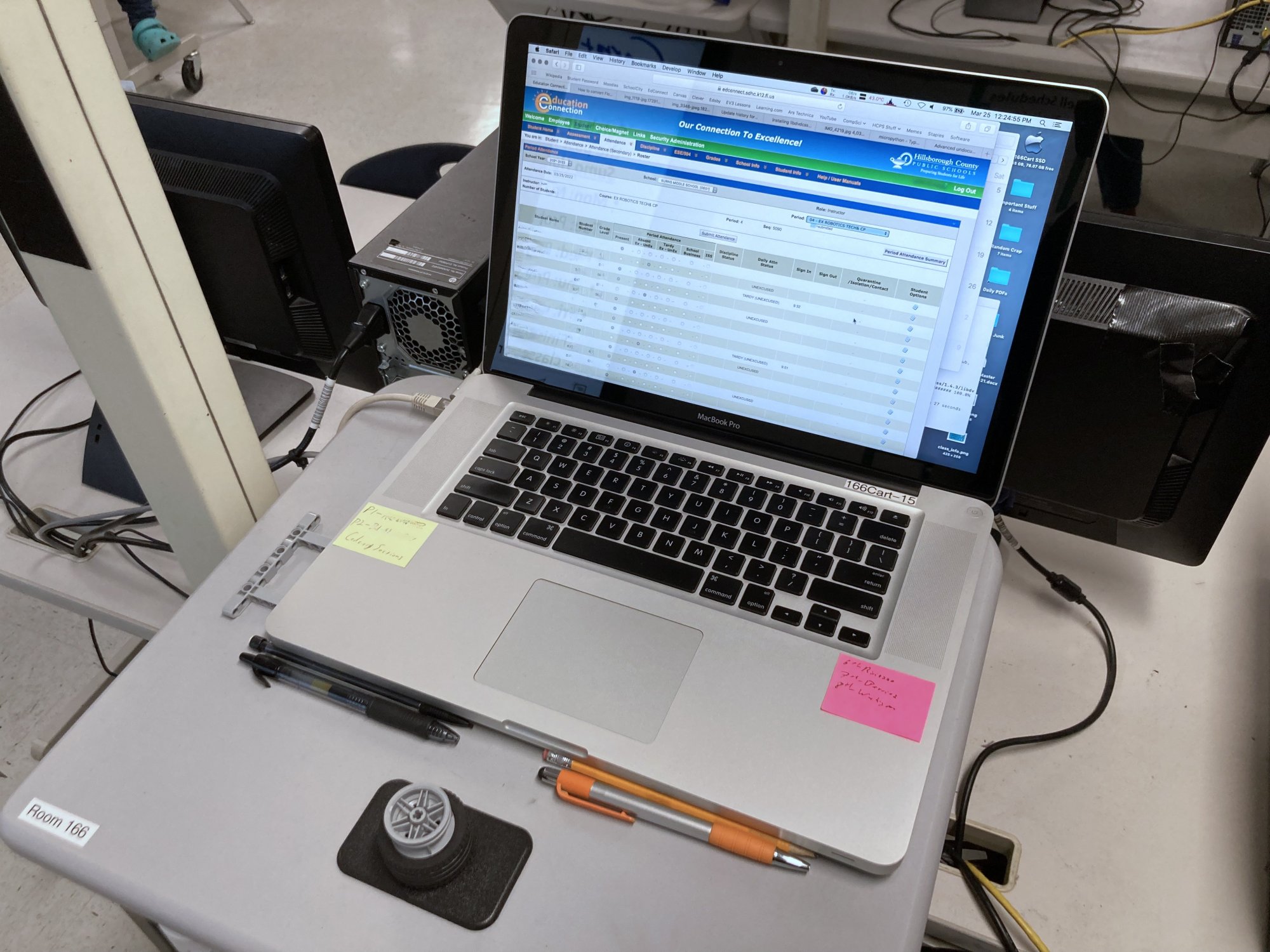 166Cart - 2011 11" MacBook Air (1.6GHz i5, 2GB RAM, 128GB SSD). It lives on a cart and does screen sharing sessions so that I can control and observe everything without being at my desk.