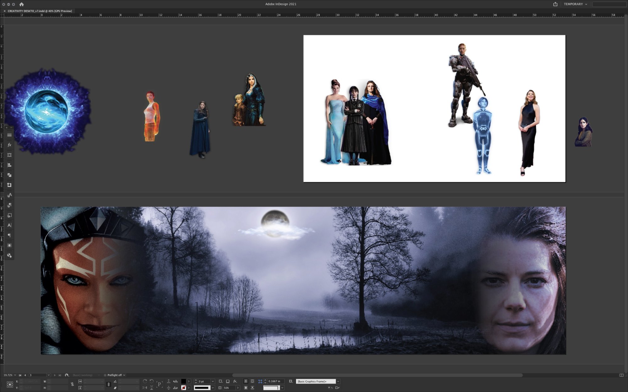 This is an InDesign document and the page size is exactly equal to 1920x1080 pixels, because that is the resolution of the two HDTVs I have attached to the Late 2009 Mac Mini I am using this desktop on. But with InDesign you cannot have a spread on page 1. So, I am using page 1 as a 'pasteboard'. Page 2 and 3 is a spread and it represents my left display (page 2) and my right display (page 3).