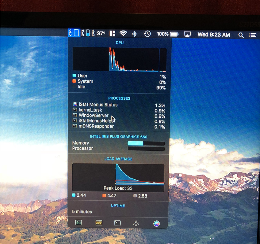 iStat Menus reports that, my normal usage (web / movie / light productivity work) works the CPU around 10 - 30%. For office work i.e. Photoshop / Illustrator it's a bit higher than that (40-55-60). Now I want to have a rough idea as to what % the CPU would run at when I've just plugged in to the 4K 27UK850 and not doing anything.