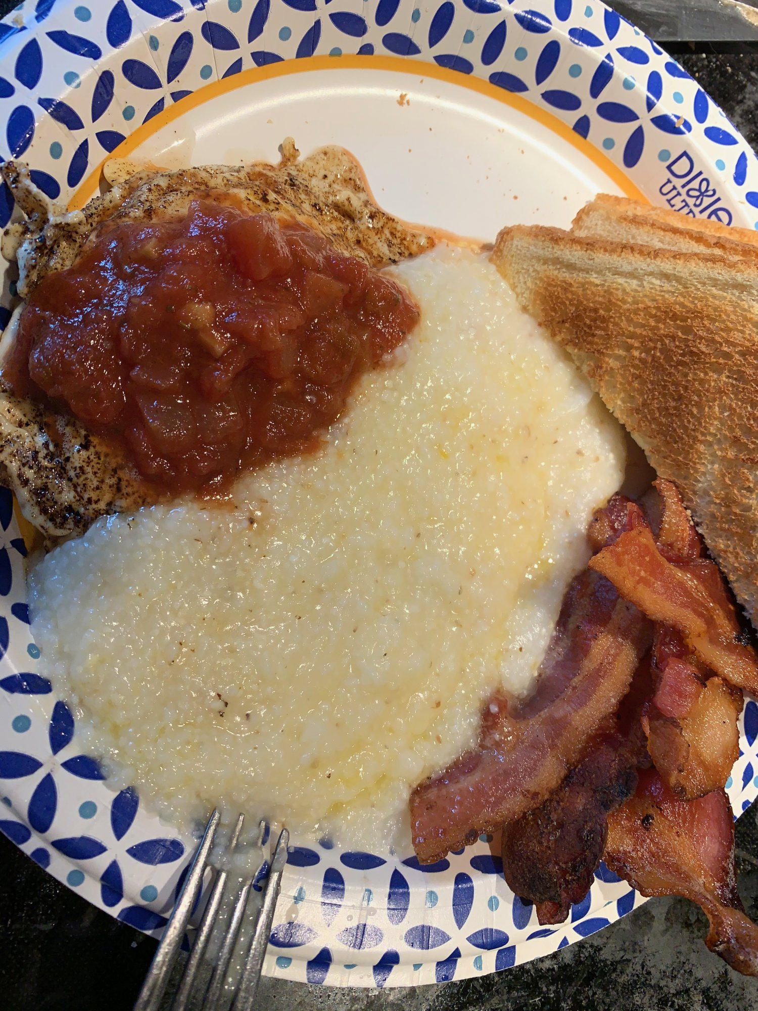 Yesterday started with my version of Southern Huevos Rancheros. Two eggs, over easy, freshly made grits, toast and Kiolbassa Dry Rubbed Bacon. Topped the eggs with salsa and mixed them in with the grits. It's a mess, but boy is it tasty!