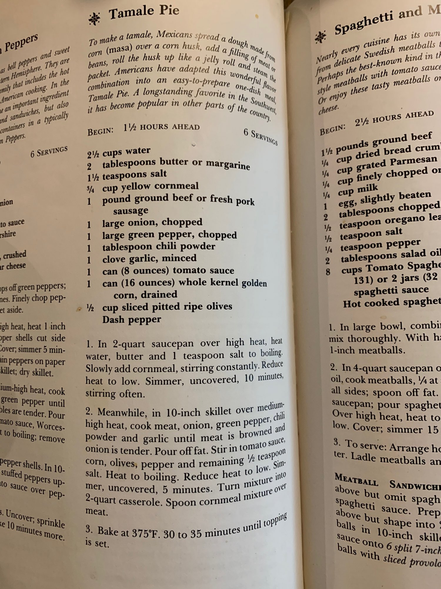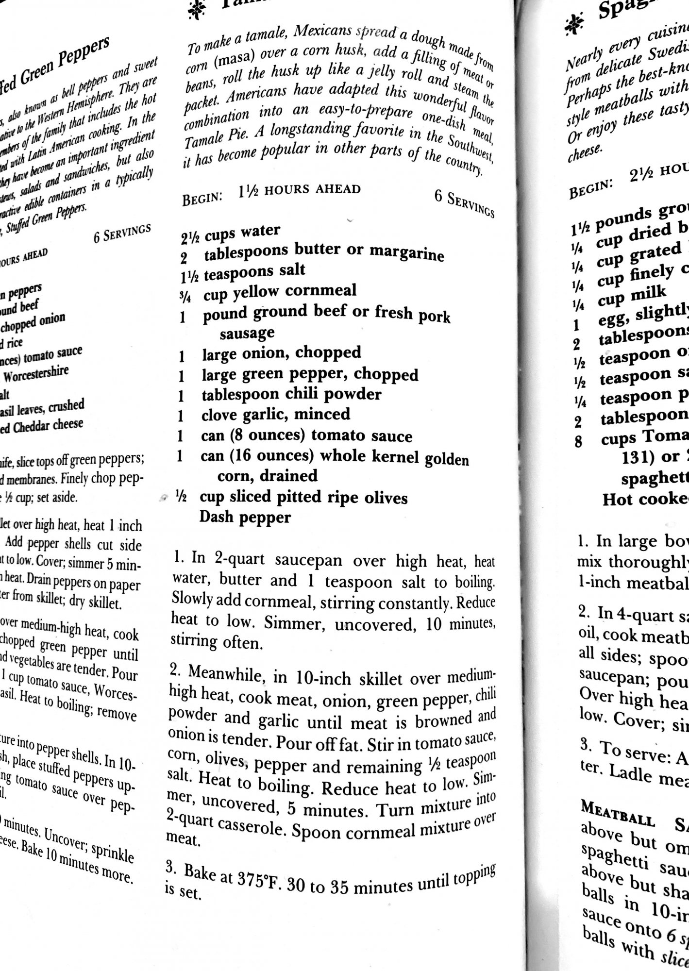 Here's the recipe I have used for ages, (from a truly awesome cookbook that was given to me by my mom back in the 80's). The only time I have had an issue is when I used a different cornmeal. Finely ground meals just do not seem to work at all for tamale pies. They do just what yours did. Oddly enough, the best results I have had are usually with the Quaker Yellow Cornmeal in the paper canister. I wouldn't use that stuff for anything else, but it works for this.