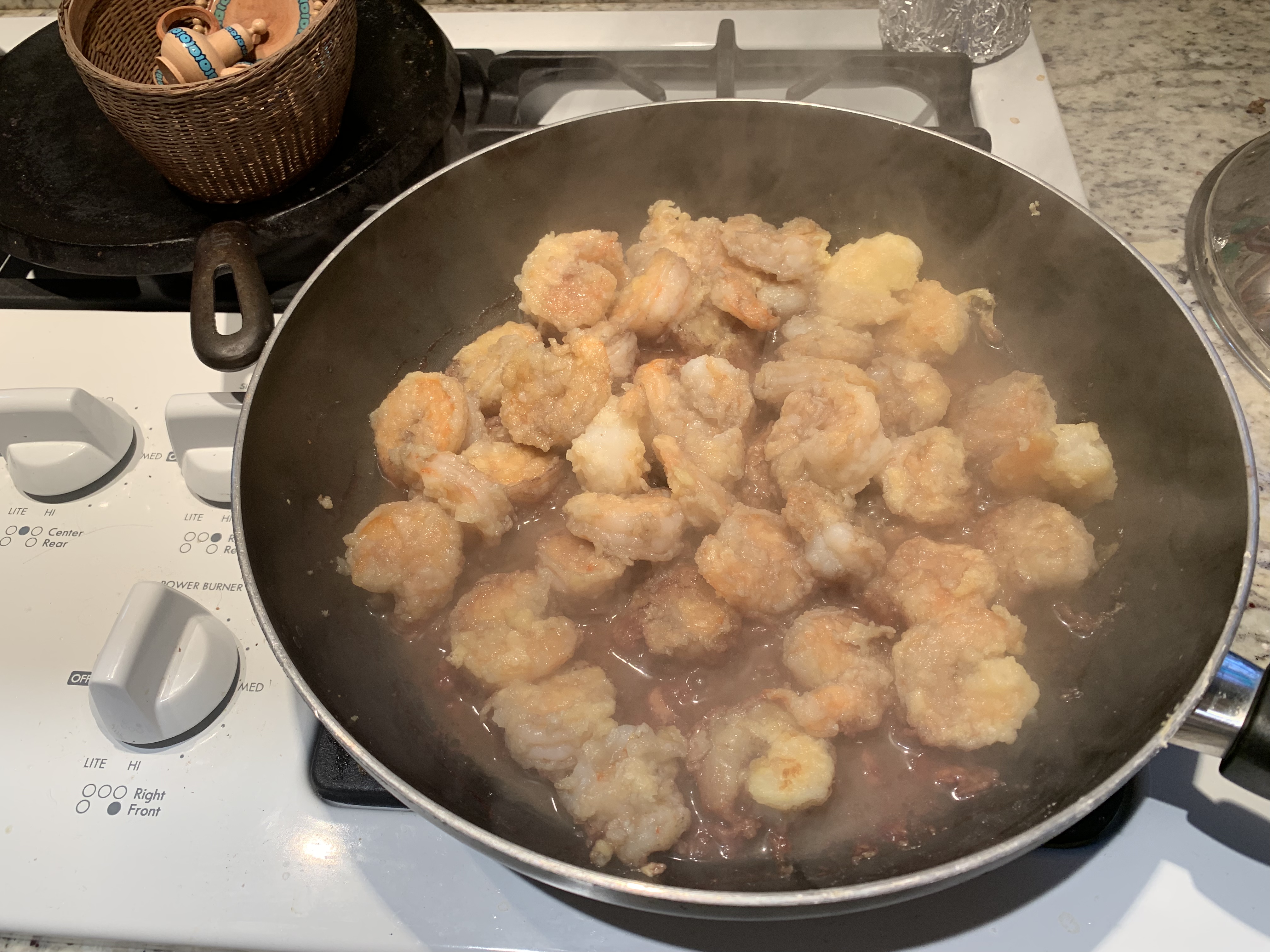 Battered shrimp In egg, flour, then sautéed in butter and wine along with leftovers, sweet potatoe casserole and chicken liver stuffing.