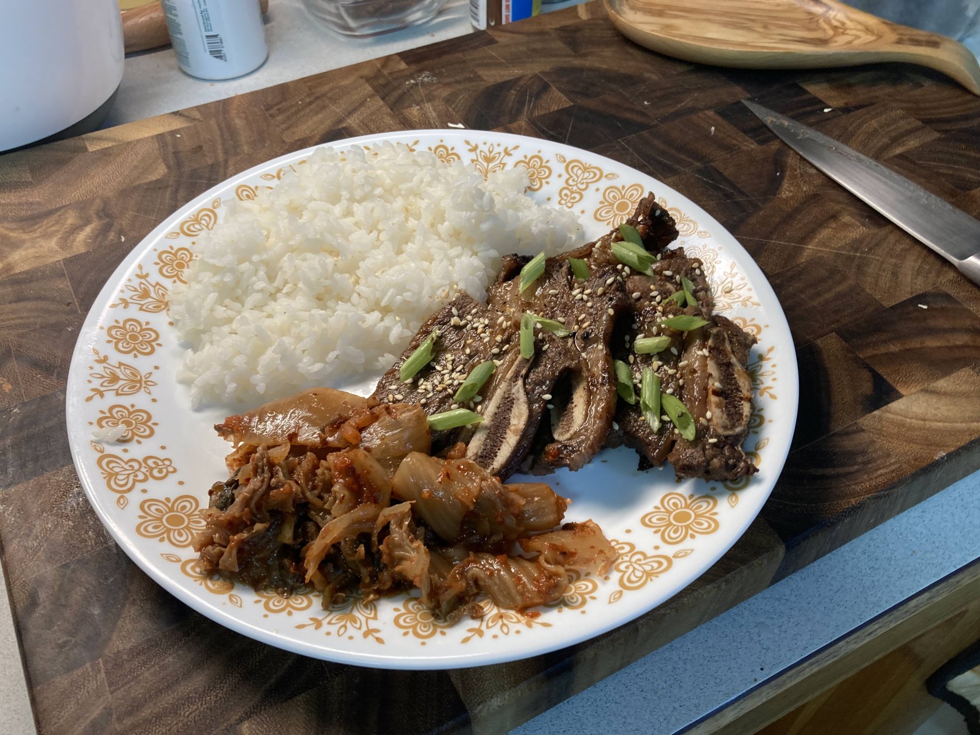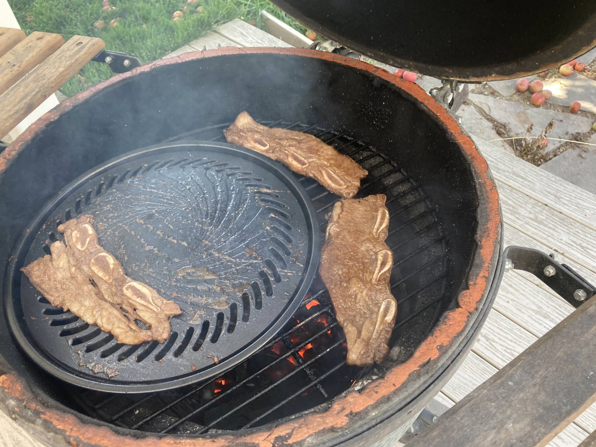 I made Kalbi, Korean flanken-cut beef ribs, marinated overnight with garlic, ginger, scallion bottoms, soy, shao-xing wine, rice vinegar, turbinado sugar, half an Asian pear (this tenderizes the beef) and a few drops of toasted sesame oil. I got the dome grill and my kamado cooker up to 400º, but as soon as I added water to the bottom tray it cooled everything down, so I didn't get the char I wanted. I went to Plan B, slid the dome to one side, then put the ribs on the grate to get some grill marks: