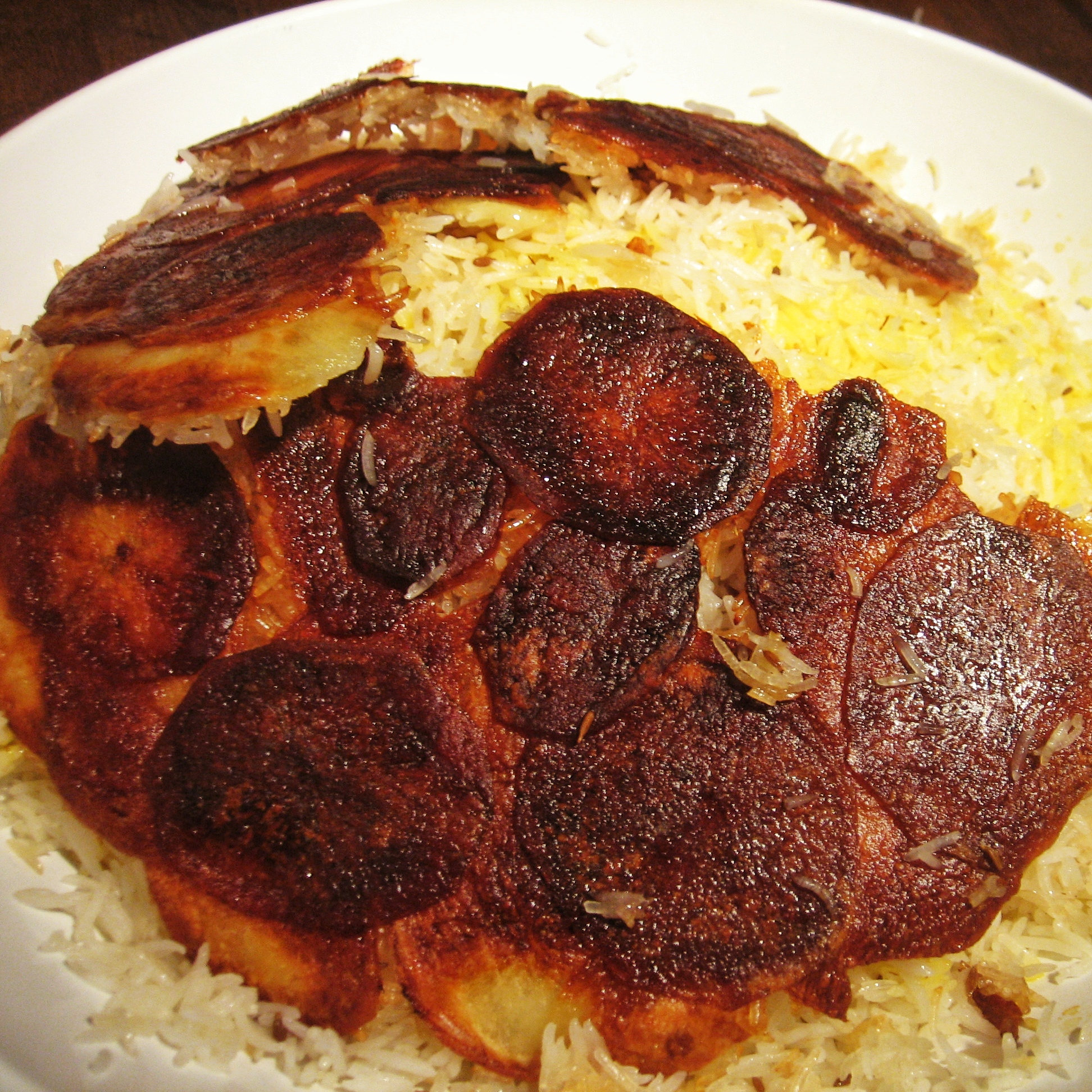 The tadeeq should be golden brown crispiness — like a rice rösti… only much better.