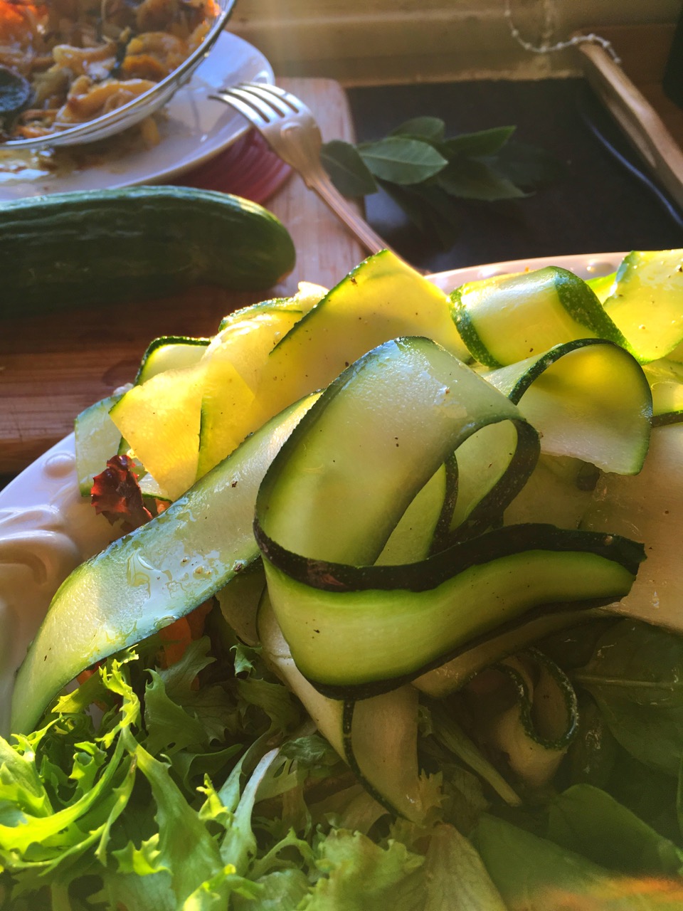 Tear and slice a whole range of leaves and herbs — and a fat zucchini thinly pared into strips.