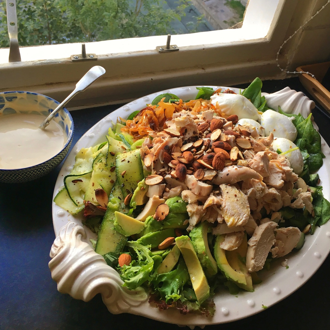 Dress it all simply with a bit of Olive oil and Balsamic — toasted nuts and seeds over the top.