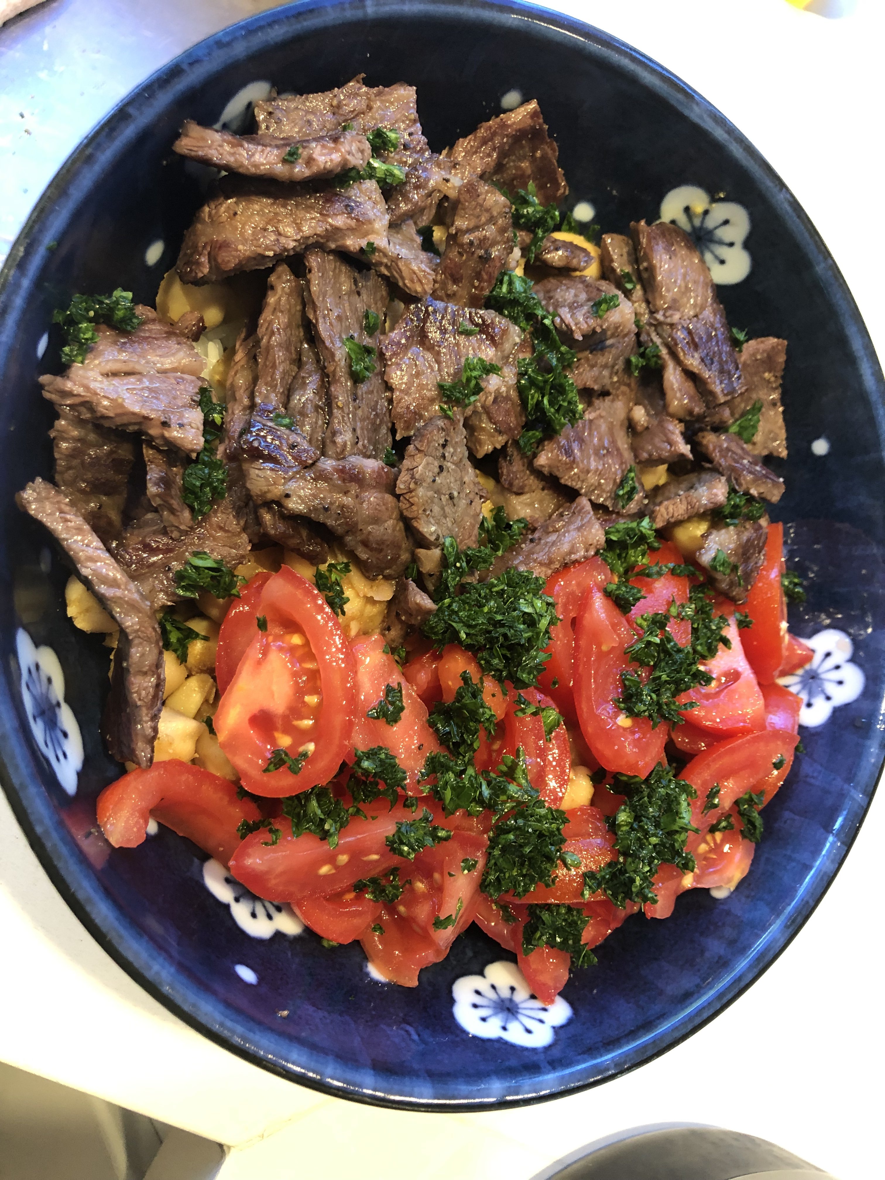 Scratch soaking them and changing water constantly over 20 hours. Then I cooked the garbanzo beans in a slow cooker for 10 hours. Once cooked I added lemon,olive oil,dash of smashed garlic (smashed with lemon and salt),cumin and salt. I tossed the garbanzo beans with the ingredients mentioned then added them on top of the rice. I bought some nice mini tomatoes which I cut into 6 pieces each then tossed with olive oil,lemon and salt. Once tossed I added those on top of the garbanzo beans to one side. On the other side I added the Wagyu Beef which I pan fried. Last I sprinkled some minced parsley on top. I cut the parsley up with a dash of salt and pepper and chopped them up together on cutting board. Japanese fine black pepper used.