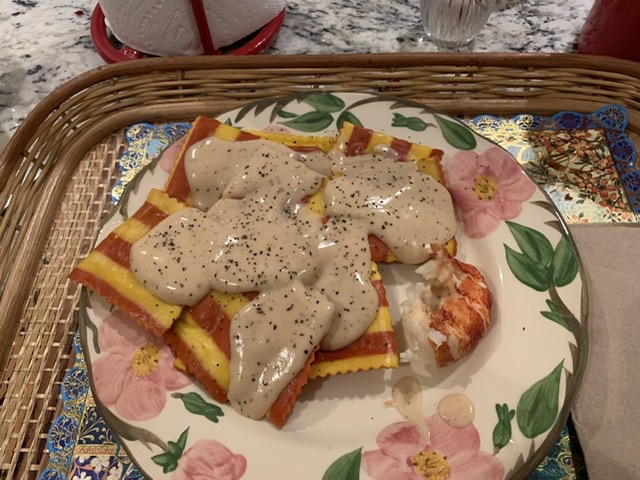 Trader Joe‘s Lobster Ravioli with truffle Alfredo sauce. It taste good except minimal or maybe shredded lobster with just not enough lobster taste and texture. It kind of reminds me of those cans of shredded crab. That’s why I hedged our bets with a small lobster tail. Not recommended (the ravioli ) if the desire is to eat... lobster. :(