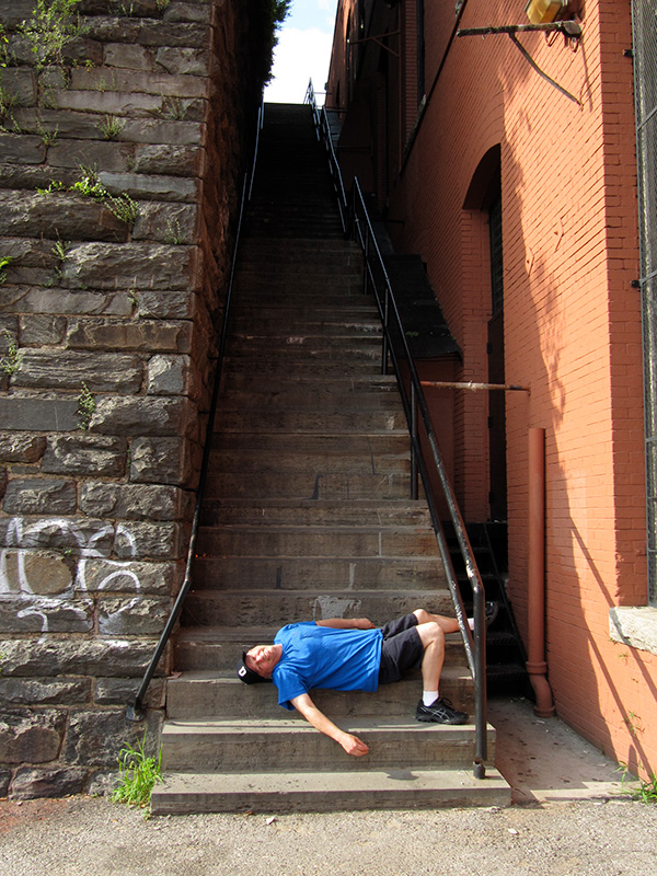 In honor of director William Friedkin, who died today, I present a frame from The Exorcist, when Father Damien Karras has killed himself by jumping out the window and falling down a dark flight of stairs, and a photo of me posing dead at the bottom of the same stairs where the scene was filmed.