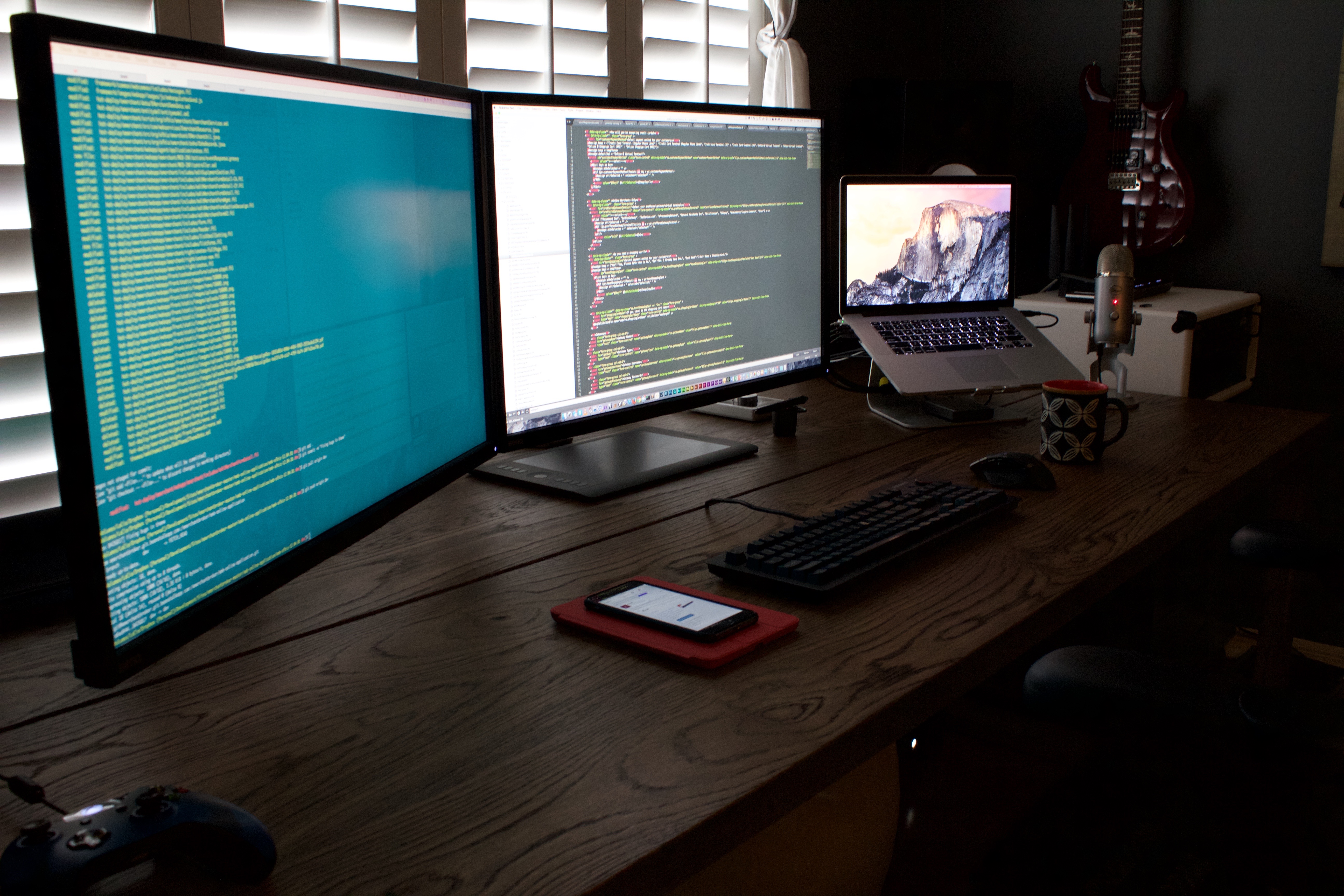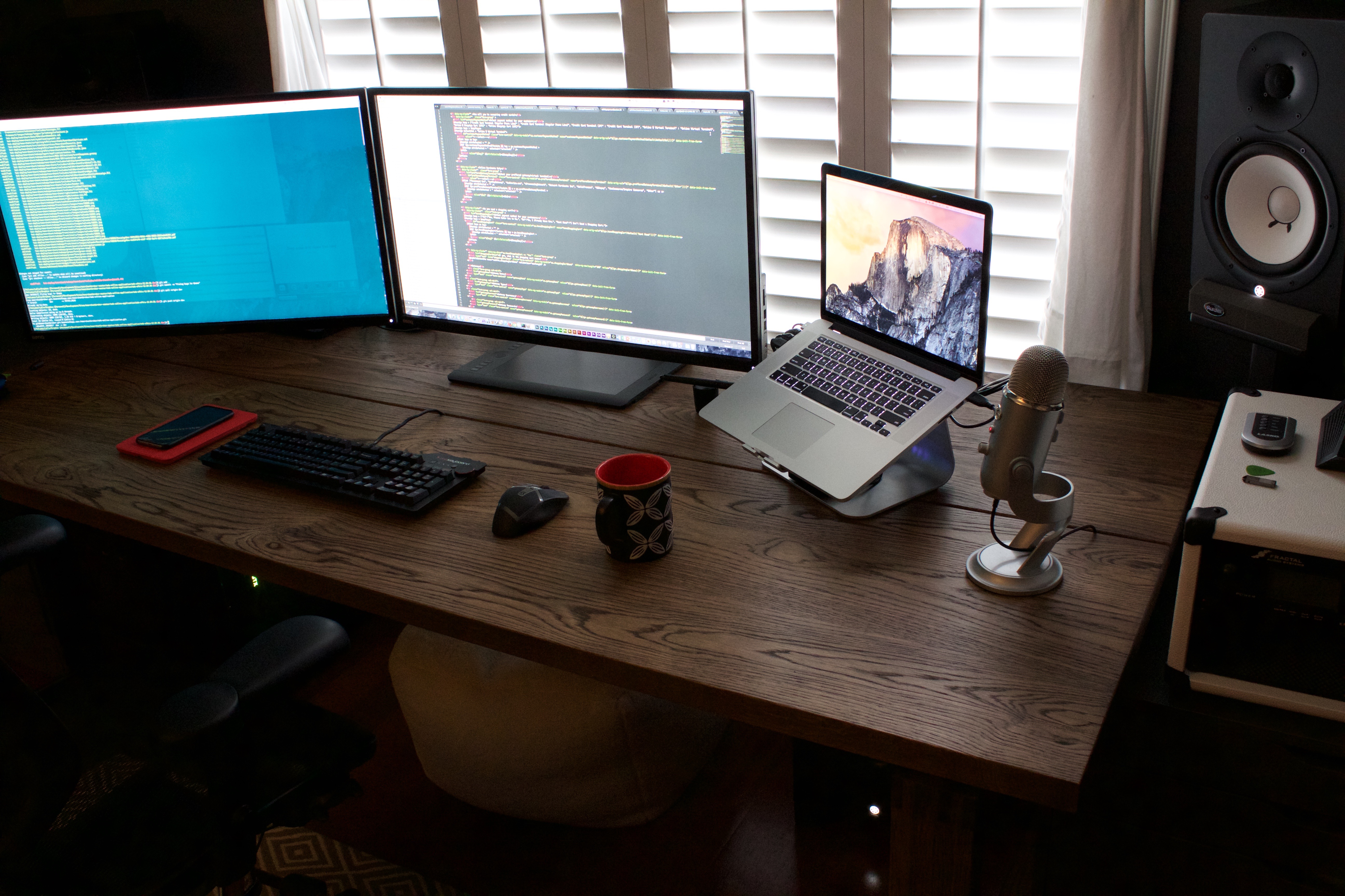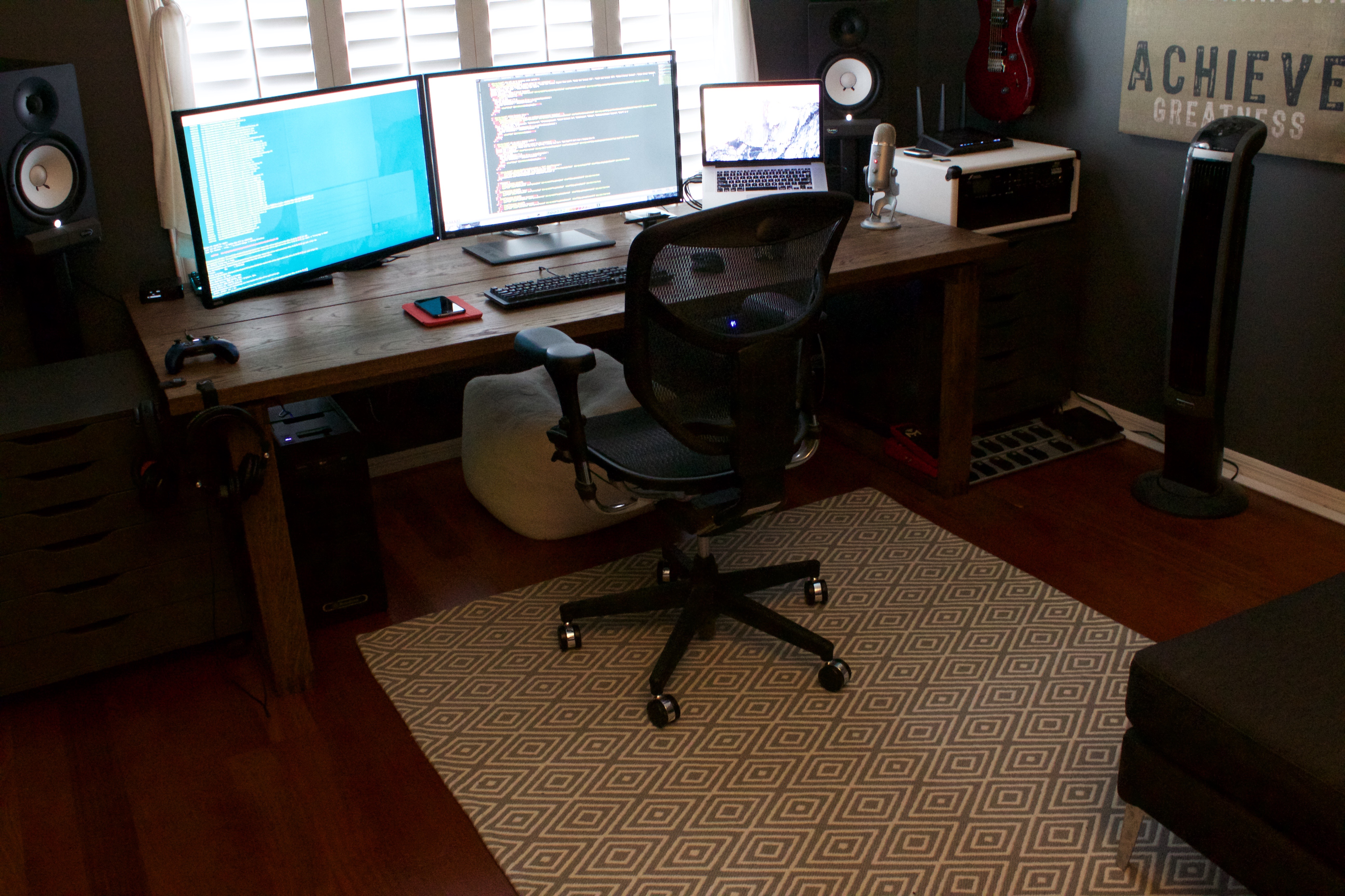 I was using a fantastic set of Hamlyn desks, which lasted for years; I was a bit of a snob about using solid wood desks in my office. But when it came time to remodel I couldn't find anything that fit my size requirements. I saw a few setups online using harvest tables, and I thought that work to fit my hardware, while giving me some breathing room -- I'm running 2 32" BenQ CAD monitors, I downgraded my Cintiq 22HD to a 13HD. The old setup with all three displays was ludicrous. The results came out fantastic. Lots of space, enough room to fit everything on a single desk.