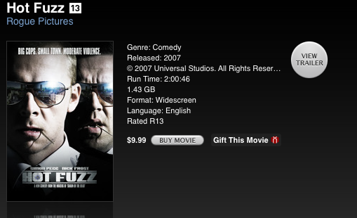 So, I had some spare change in my pocket and I went to the local Fry's to see if I could pick up a good movie at a decent price. Turns out that they had neither Hot Fuzz nor Night at the Roxbury in stock. I was a bit bummed, so I went home and checked iTunes to see if it had the movies. It doesn't have Night at the Roxbury, but it DOES have Hot Fuzz..... on PRE-ORDER!