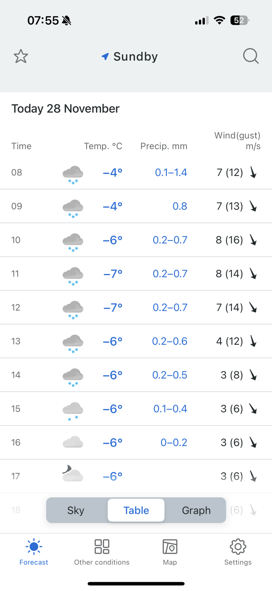 In both the iPhone apps I use, Apple’s Weather and Yr (which is generally the best) predicted snow more or less all day, while my watch though the chance/risk was 0% all day…