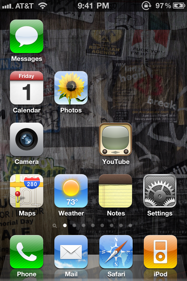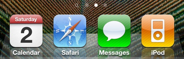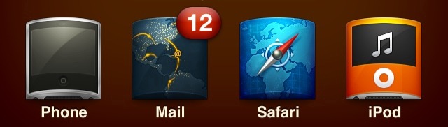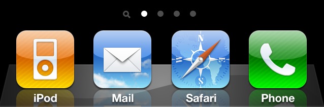 Hence my dock: Phone, Mail, Messages, iPod (I'd love to have Phone then Messages, but two green icons together is weird).