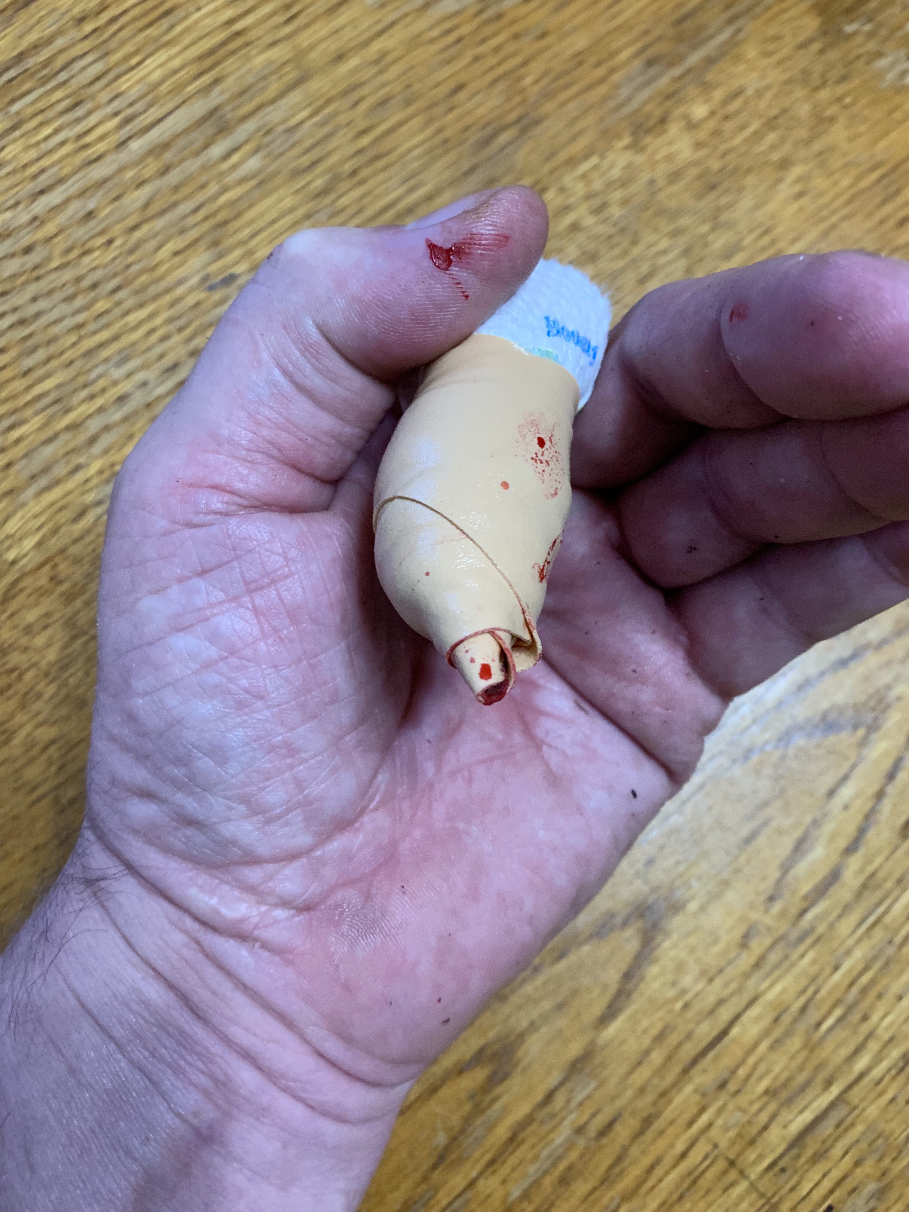You should definitely send that photo, along with a brief story of how it happened, to the makers of Bounty. When there's blood to be stanched, do you really want to rely on bargain brand paper towels?