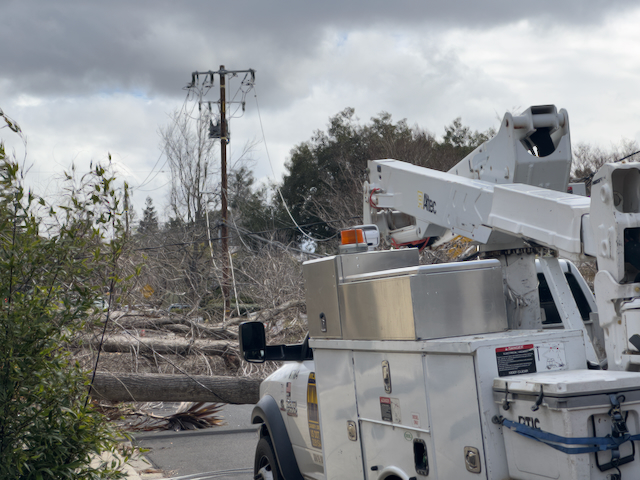 Power was out for for almost 60 hours. Trees decapitated a power pole: