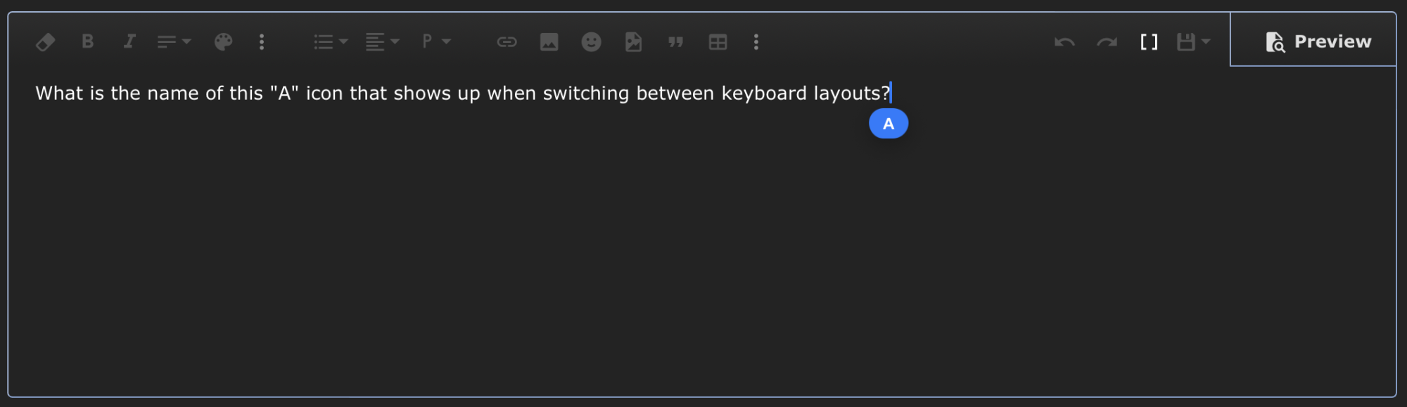 Nermal Moderator Original poster Staff member Dec 7, 2002 21,629 5,658 New Zealand Sep 28, 2023 #1 What is the name of this "A" icon that shows up when switching between keyboard layouts? It keeps popping up when I'm in games (even when I haven't switched layouts) and I can't figure out the name of it and, more importantly, how to get rid of it.