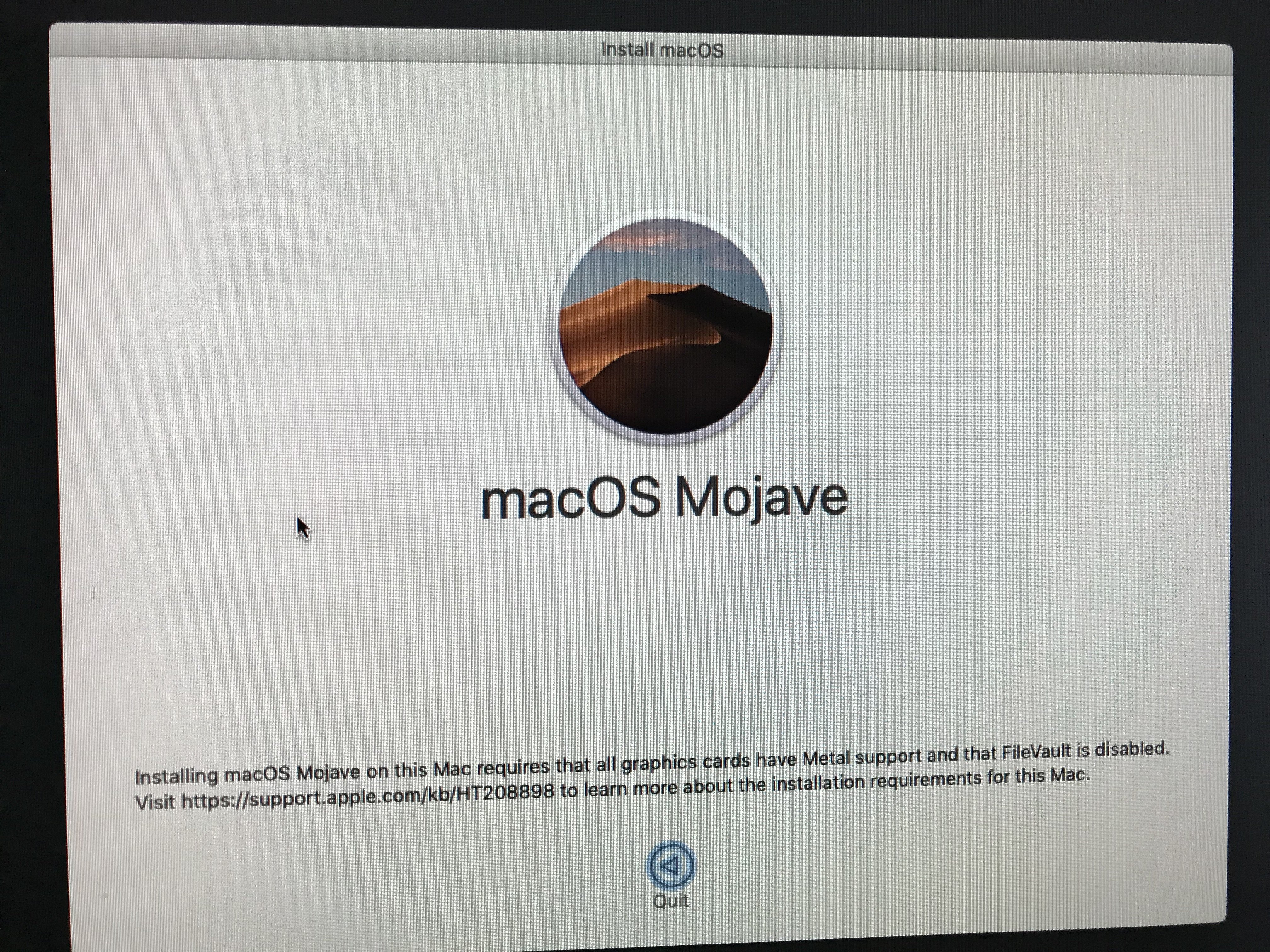 "Installing macOS Mojave on this Mac requires that all graphic cards have Metal support and that FileVault is disabled.