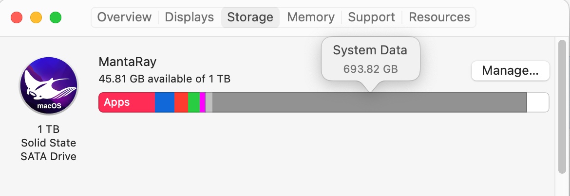 About this mac shows a huge grey bar that has a tooltip that reads System Data 693 GB!