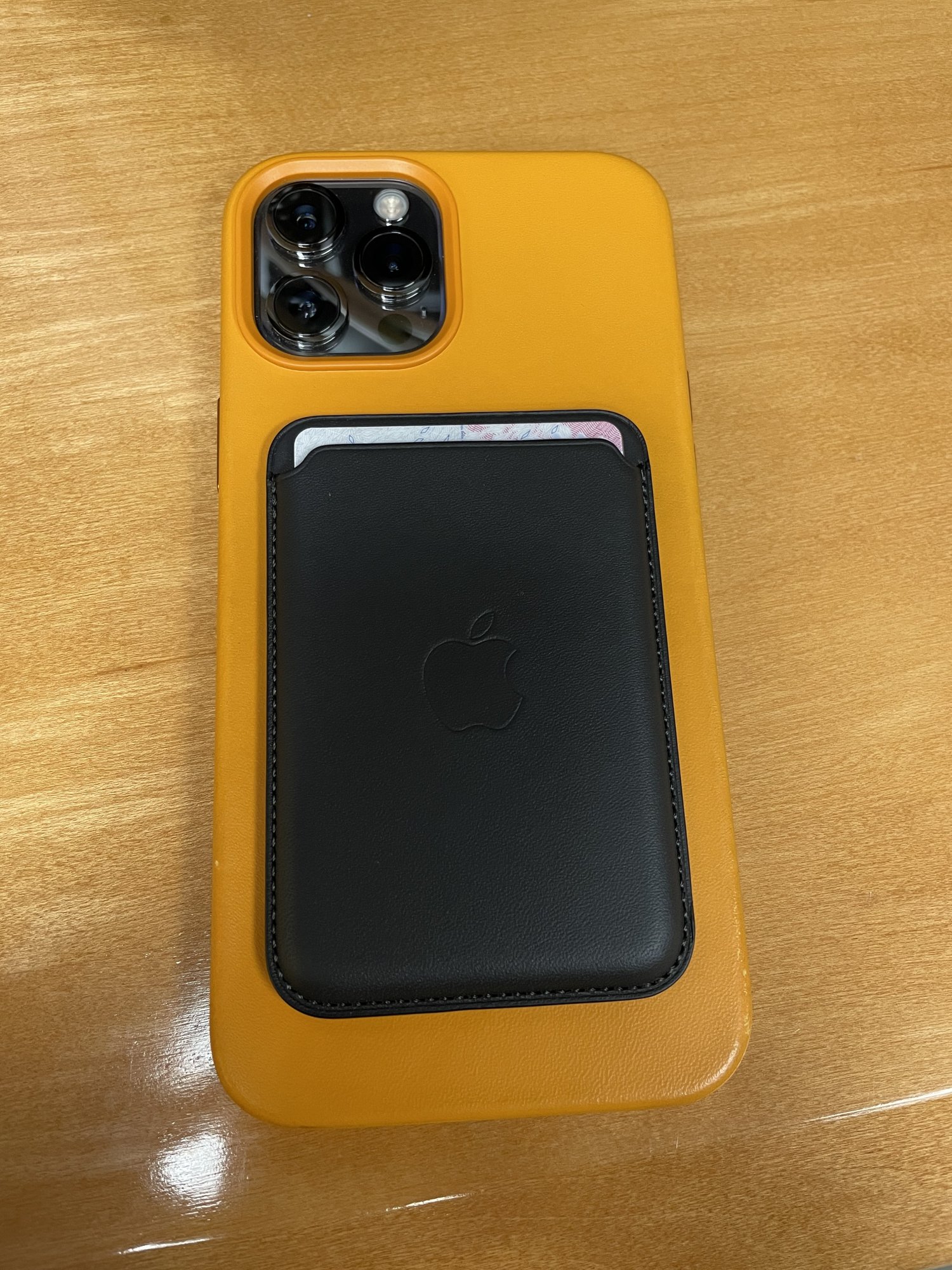 Looks great with the sleek black wallet and the awesome glossy black pro max camera cluster.Went with a California poppy Leather case for my 12 PM. Coupled with a black MagSafe wallet.
