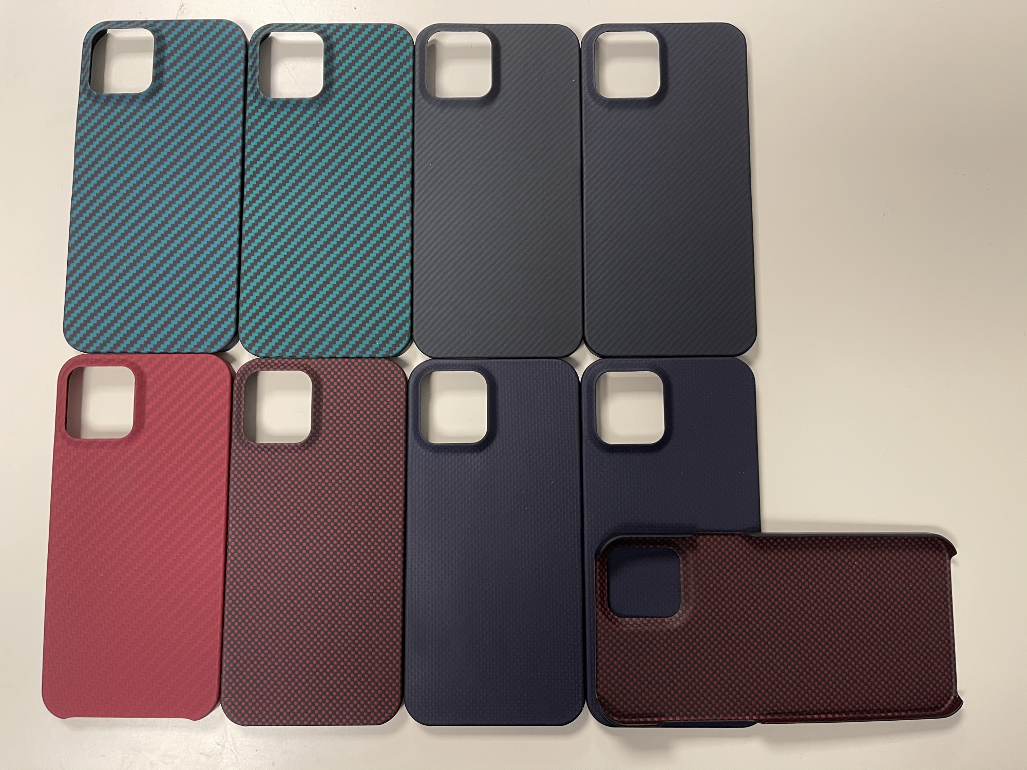 The bottom right case is a special edition... navy blue Aramid outside with a black and red weave inside (also includes the same magnets inside the case as Pitaka).