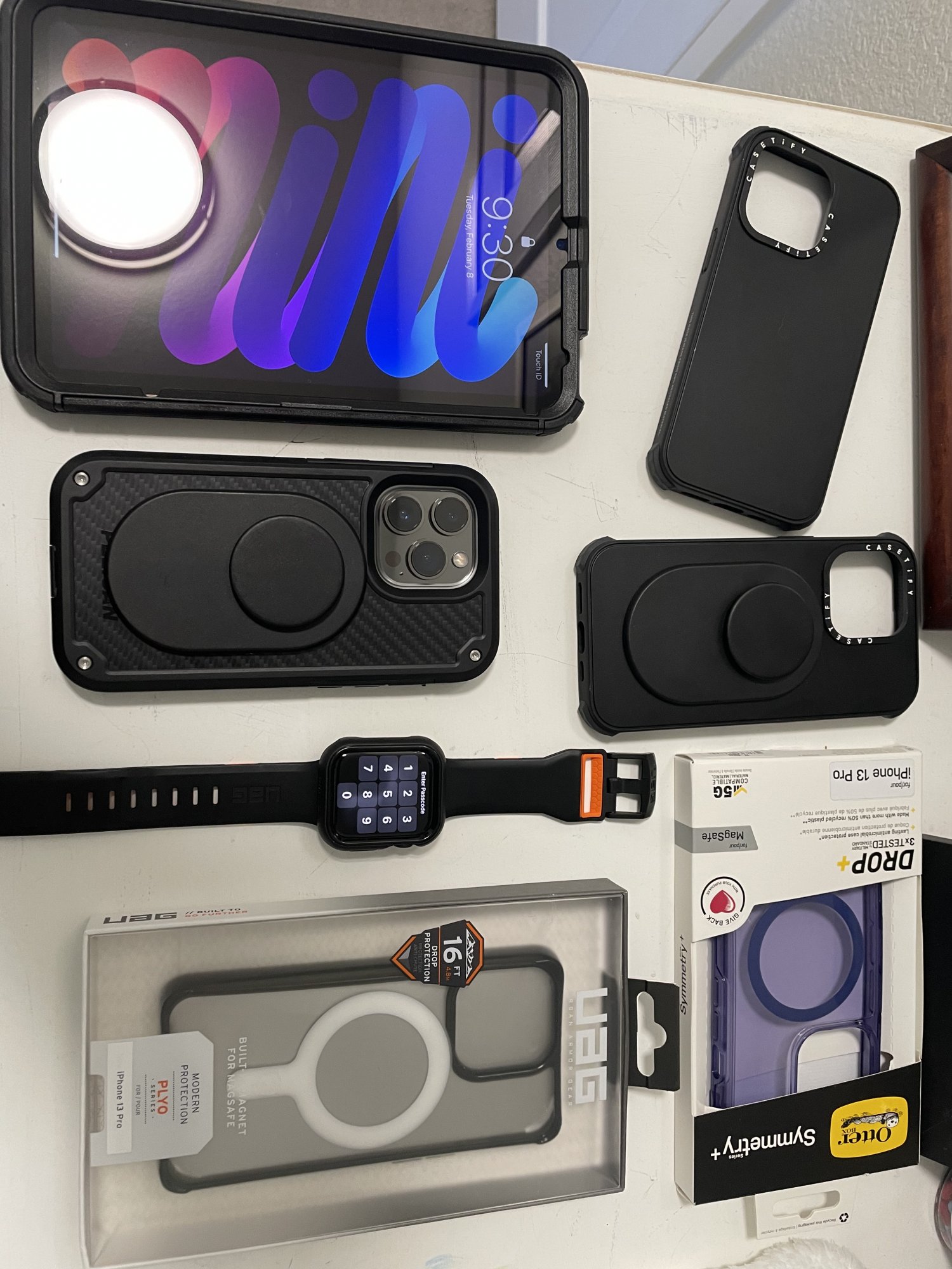 Here is my setup Tee, (with some of my personal favorite cases) I have an iPad mini 6 with an otter box defender case on it. I have an iPhone 13 pro, with a Pelican Shield case, that I added MagSafe to. Here is my Apple Watch SE with UAG band and an Otterbox bumper on it. And here are some of my favorite cases that I have. I got the Casetify and Otterbox symmetry because of your video reviews.