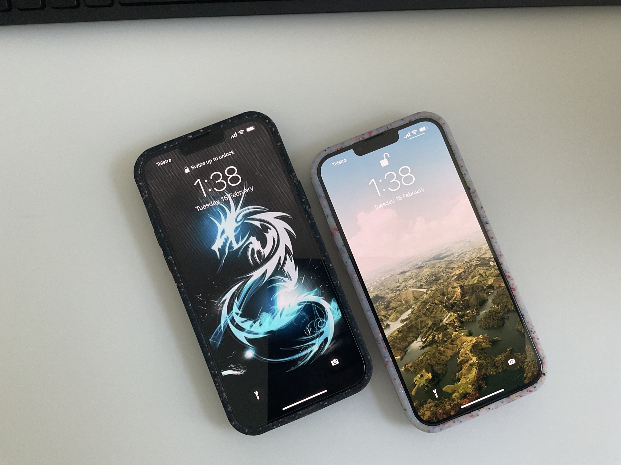 Black with graphite iPhone 13 PM and white with Sierra Blue iPhone 13 PM.
