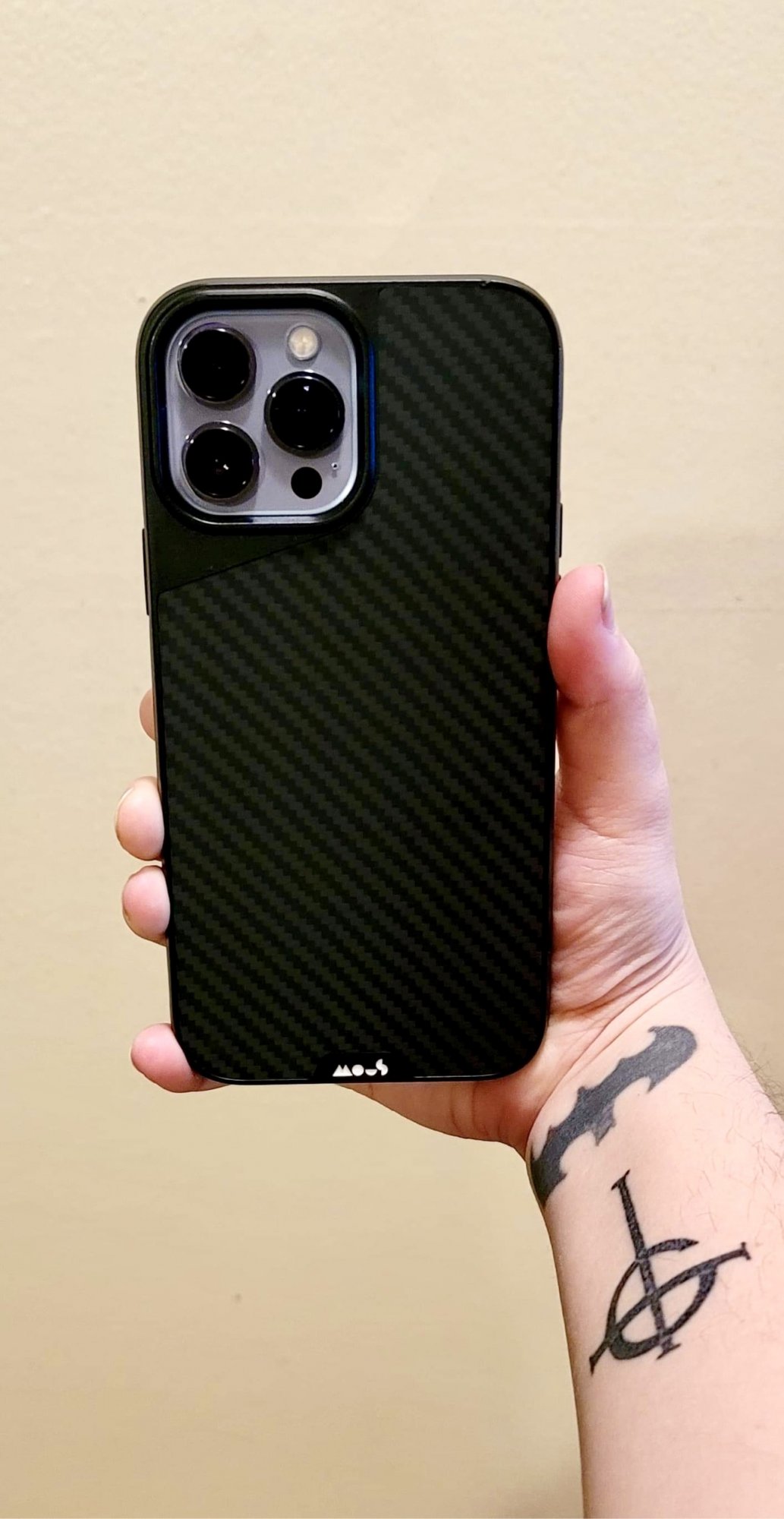 The Aramid Mous is a beauty, but the fingerprints do drive me a little insane.I’ve been back and forth between a lot of cases but I keep going back to my Mous case every time. It’s frustratingly a fingerprint magnet but it did save my iPhone’s life a couple months ago. I was getting out of the car at a store and my phone fell out of my pocket and landed hard in the parking lot beside the car. The phone wasn’t damaged at all but the case got chipped in the top right corner. Definitely a lifesaver!