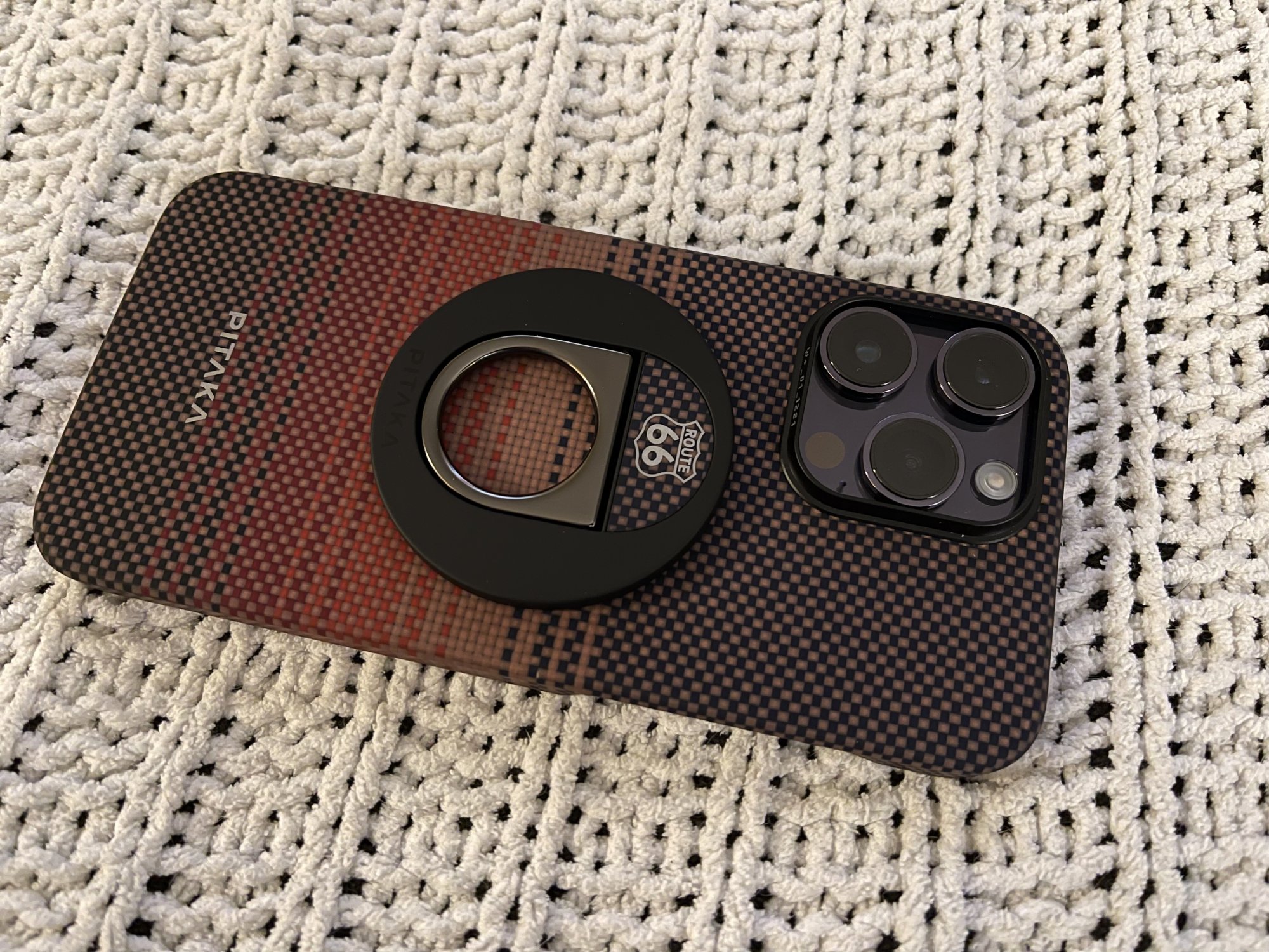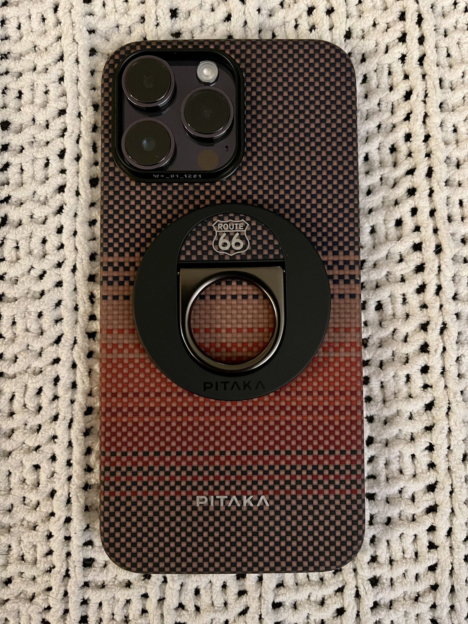 I ordered the new Pitaka Sunset Moment case as soon as I got the email about it. Here it is. This is my first Pitaka case, and I'm loving it so far. It's very thin and obviously leaves a bit of the frames showing, so I am more careful with my phone, but the little magnet holder thing makes it pretty easy to hold it now. It definitely feels like I'm holding the iPhone naked. (I have the deep purple iPhone, by the way.) The next case on my wish list are the Iris and the new Sky blue silicone cases (even though the sky blue won't match that well).