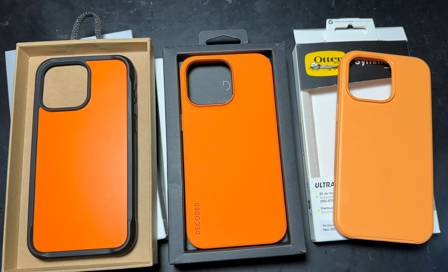 A pic I had taken of my current orange cases (L to R: Nomad Rugged, Decoded silicone, Otterbox Symmetry):