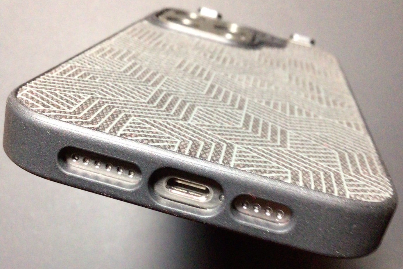 Next up, the Synthesis: this case is a harder plastic, more firm all around. The texture on the back is a little smoother than the Sheath. The edges of the case have a dotted pattern that adds extra grip. Prior to purchasing, I was worried the dotted grip might dig into my palm when holding one handed; it’s actually not a problem. The dotted pattern stops well before the corner, so that if the corner is dug into my palm it’s not bothered by the grip. The bottom of this case is not smooth like the Sheath, but with the grippy edges, I don’t find myself using my pinky prop. Even if I do use my pinky, the slight texture doesn’t bother me. There’s no microfiber lining interior, which would’ve been nice but, this Synthesis seems just a hair thinner than the Sheath, which may be due to that lining. This case is even more tightly fit than the Sheath, due to its harder plastic. I do have difficulty taking it off; it actually hurts my thumb a little prying the camera corner first, working down to the bottom right corner.